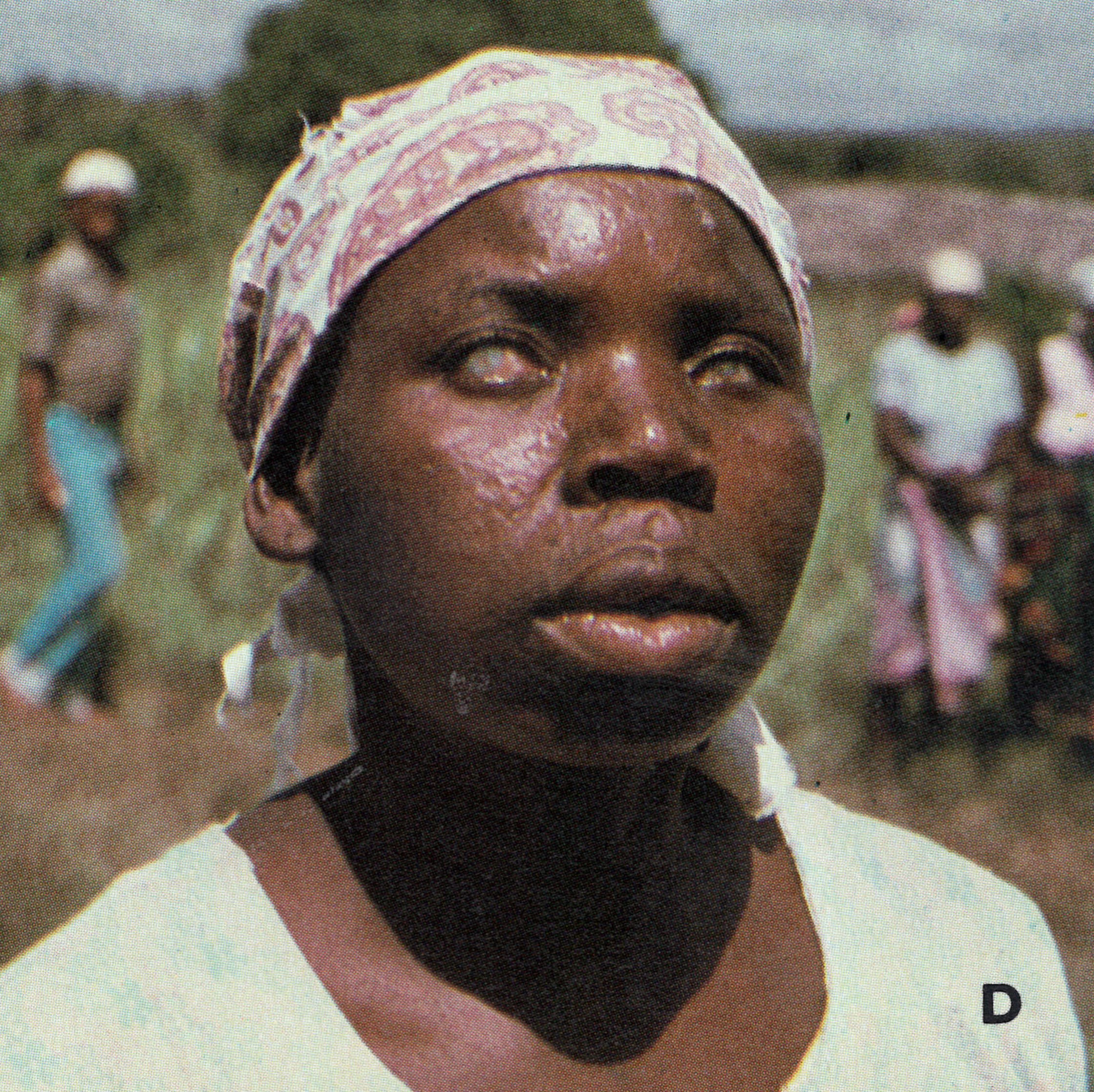 Plate1.27. Sequelae of smallpox. Shortly after recovery, the sites of pustules are usually depigmented in dark-skinned subjects (A) or red in fair-skinned subjects (B). Most cases of variola major leave facial pockmarks, which may be deeply pigmented (C); blindness is a rare complication (C and D). (B from Herrlich et al .,196.)