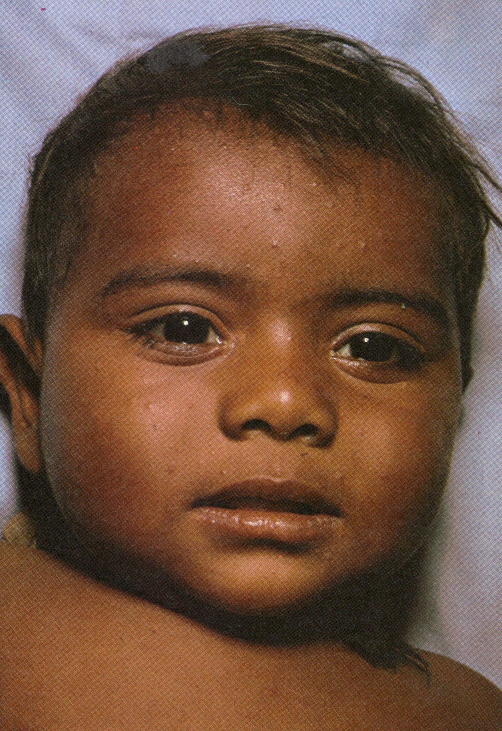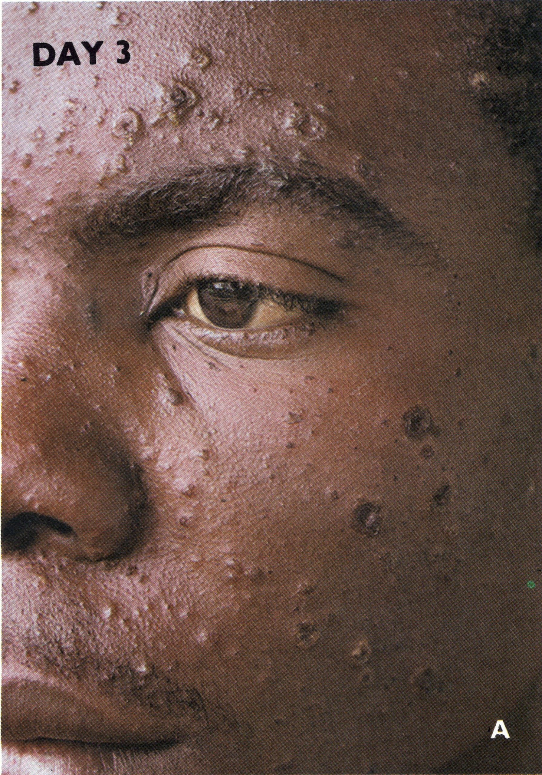 Chapter 3 concludes with an integrated picture of the pathogenesis of smallpox, which was a generalized viral infection with no recognizable primary lesion but with a viraemia whose onset was manifested clinically by the pre-eruptive fever, followed a few days later by the development of a focal eruption on the mucous membranes and skin. Following the example of Ricketts (1908), our description of the clinical features of smallpox is in large part based on illustrations, using a series of colour photographs taken for WHO during the smallpox eradication programme in Pakistan. The subject was a 9-month-old unvaccinated male infant in whom the onset of fever was recorded 1 day before the rash first appeared. He suffered from the commonest form of smallpox—discrete ordinary-type—and recovered without complications. Daily photographs were taken, until recovery was complete, of the entire subject and of face, trunk, arms and legs. Only a limited selection of these can be reproduced here, but they serve to illustrate the nature, evolution and distribution of the rash of smallpox. The temporal succession will be described in terms of the day of rash.