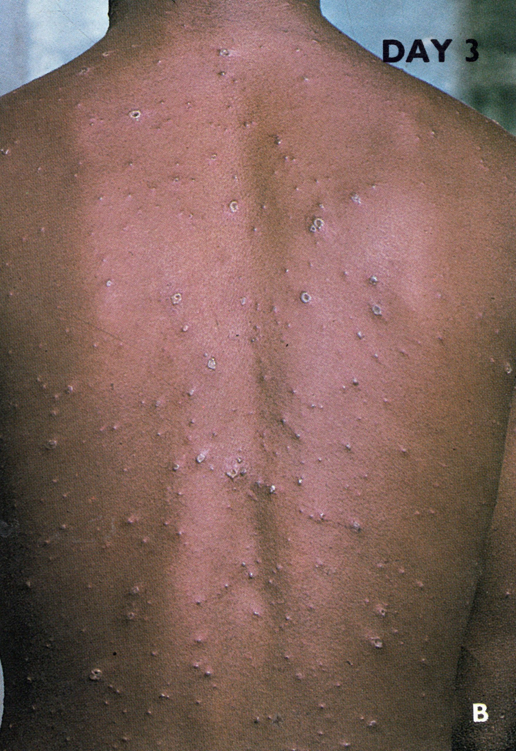 There are few diseases characterized by a rash that did not at some time suggest a diagnosis of smallpox, occasionally with dramatic effect in non-endemic countries. Acne, scabies and insect bites may be mentioned as examples. Coxsackievirus infections could pose a problem (Mukherjee et al.,1976), and in countries in which both diseases were endemic, dengue haemorrhagic fever and other arbovirus infections associated with a rash were sometimes initially diagnosed as smallpox.