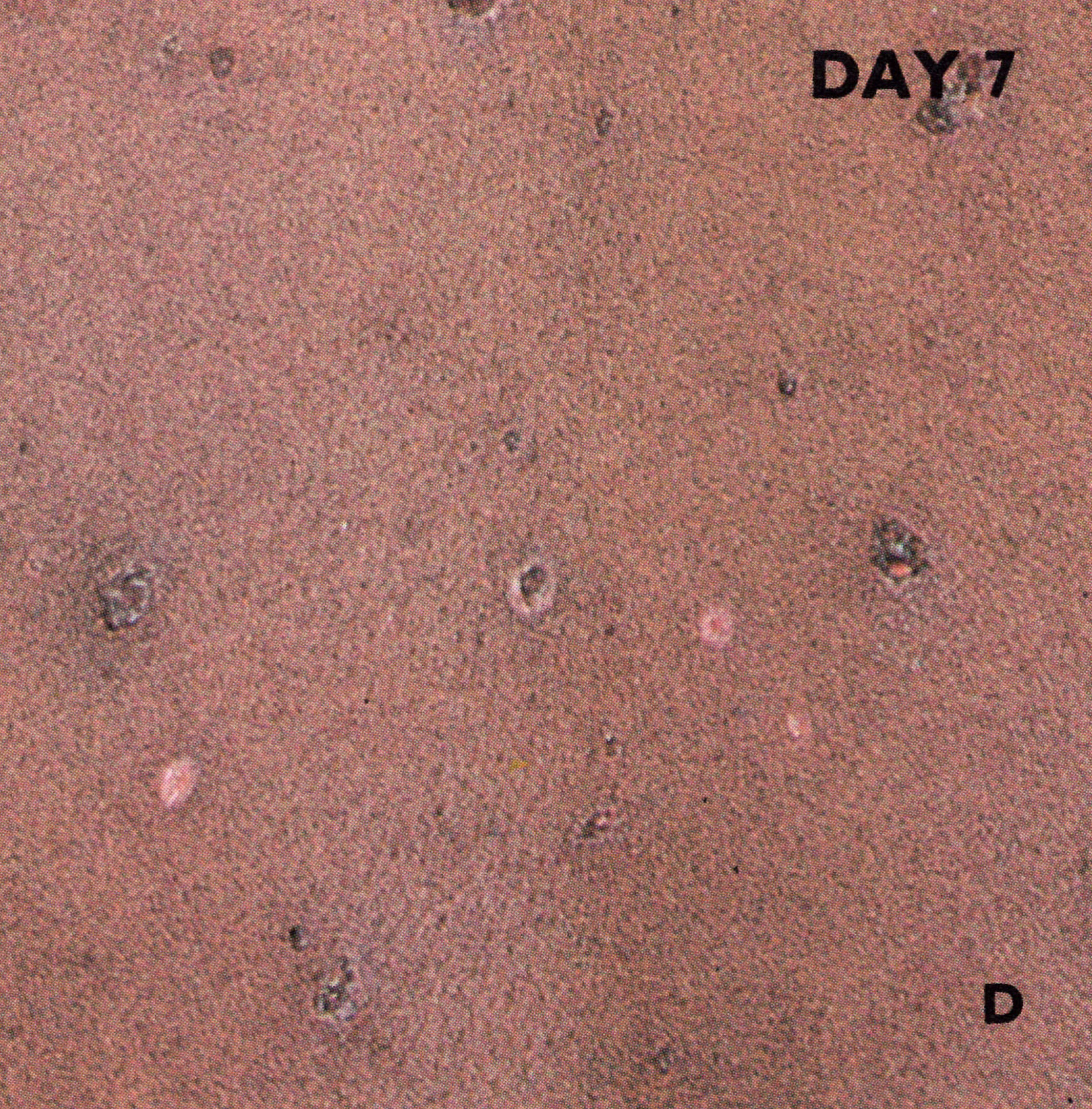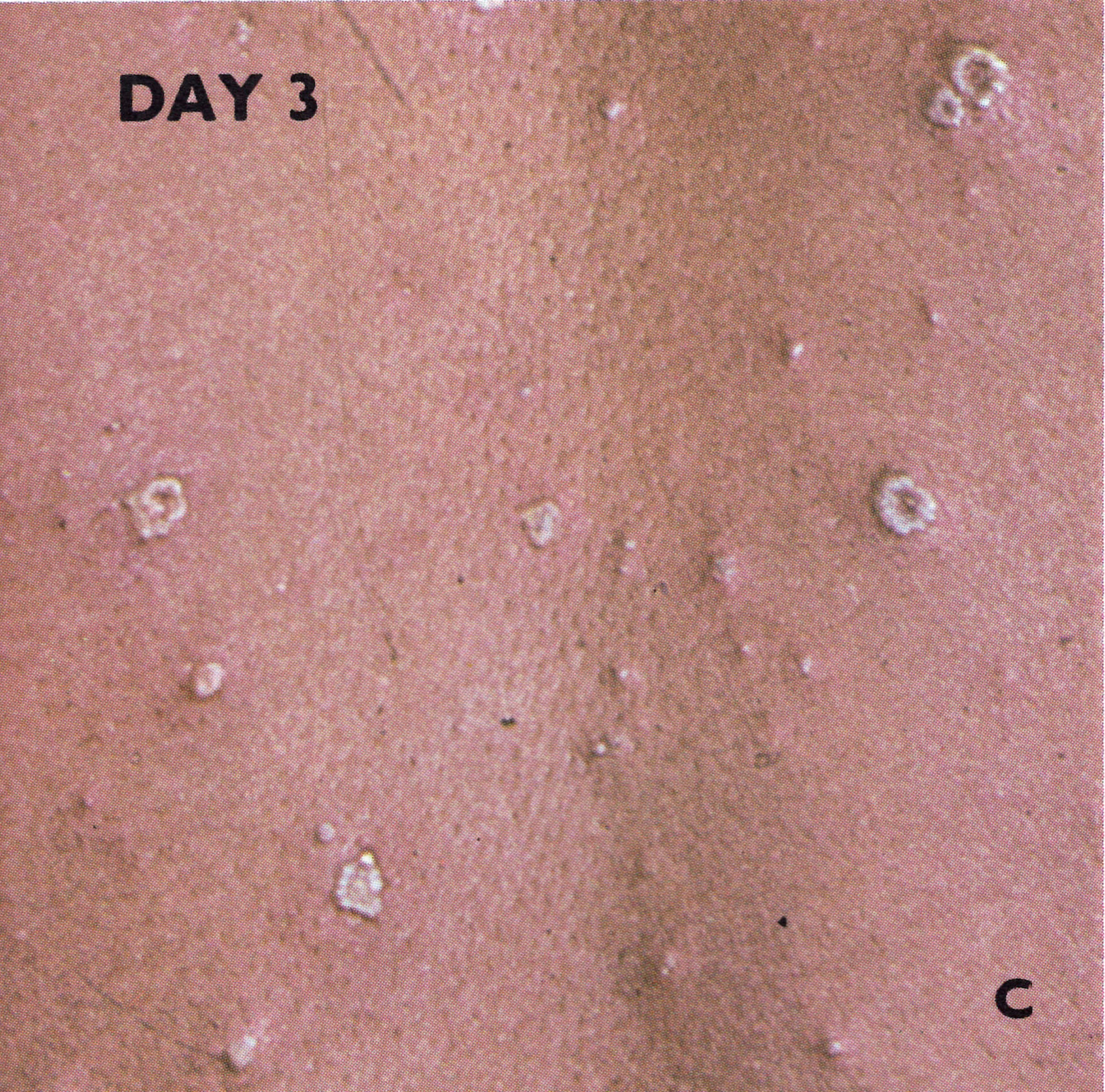 By the 2nd day of rash the macules were raised and usually described as “papules”. Reference to the histopathology indicates that this term was really a misnomer; they were raised above the skin surface because of the effusion of fluid into the tissue spaces and were in fact early vesicles (Plates 1.5 and 1.6). By the 4th or 5th day they were obviously vesicular, containing at first an opalescent fluid, which became opaque and turbid in another 24-48 hours (Plates 1.7-1.9).