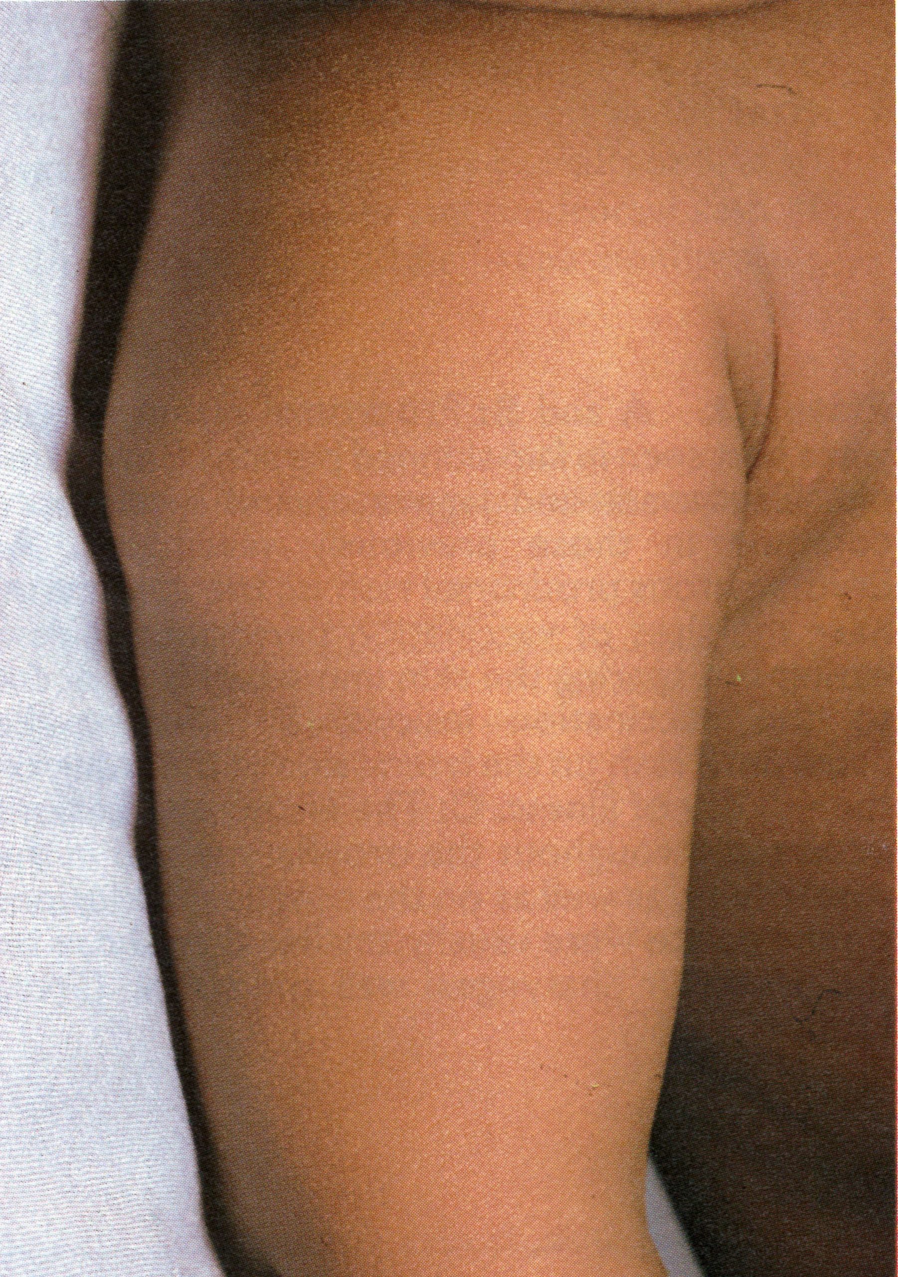 Plate 1.18. Confluent ordinary-type smallpox in an unvaccinated woman in her twenties, on the 9th day of the illness. Pustules were confluent on the face, forearms and legs but discrete on the trunk. (From Stojkovic et al., 1974.)