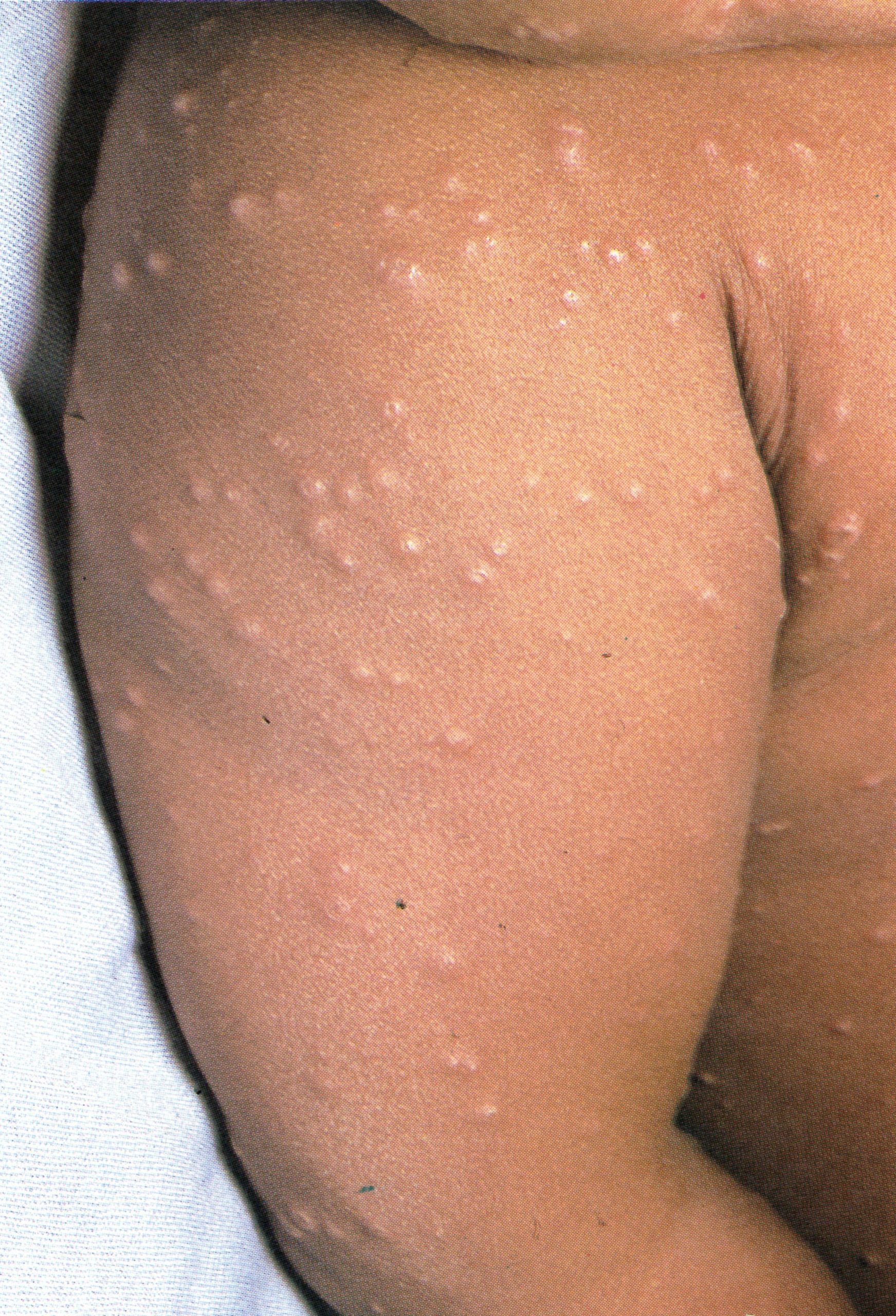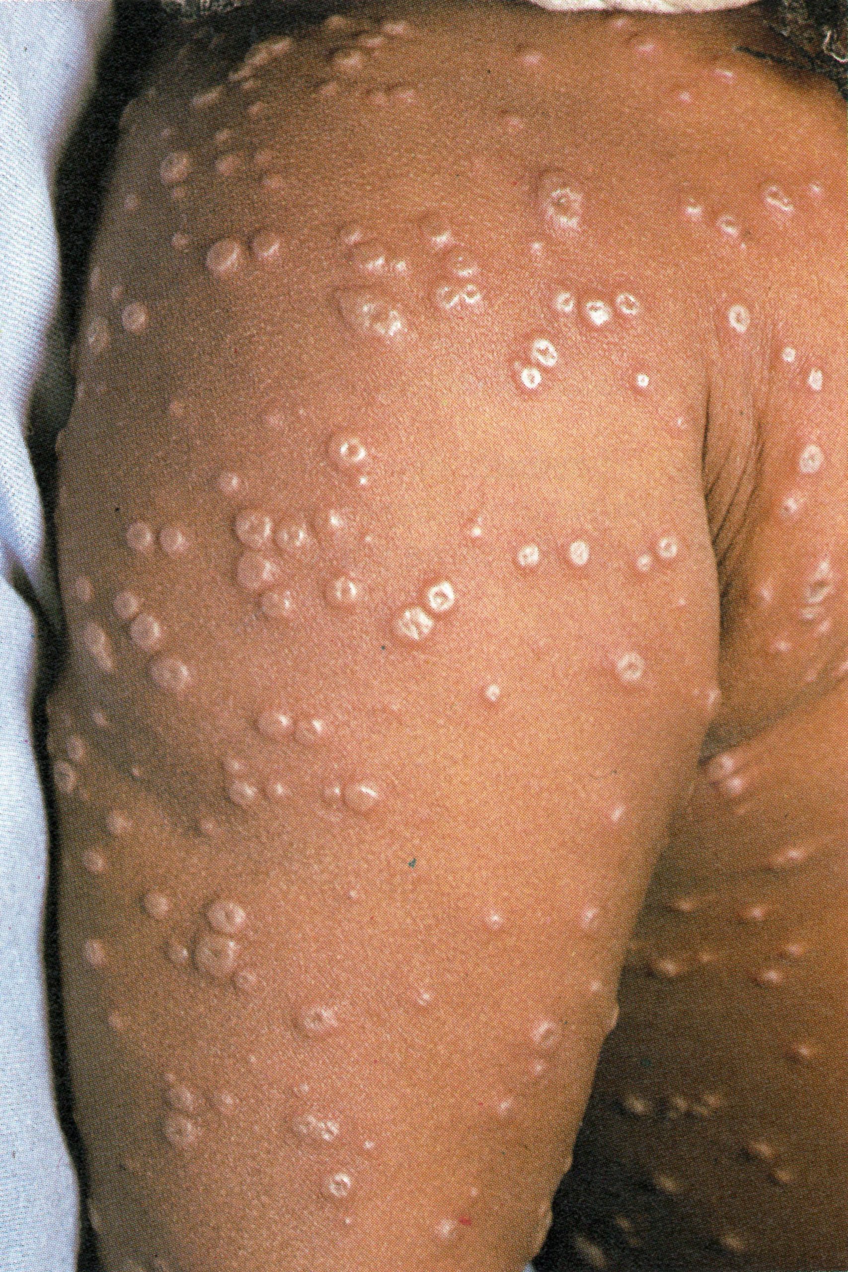 Plate 1.8 Fifth day of rash. Almost all the papules have now become vesicular or pustular, the truly “vesicular” stage usually being very brief. Some of the lesions on the upper arm show early umbilication.