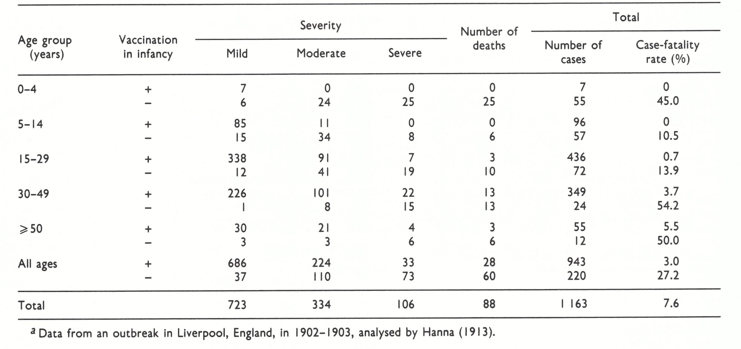 Data published by Hanna (1913) from an outbreak of variola major in Liverpool, England, in 1902-1903, illustrate clearly the ameliorating effect of childhood vaccination on the severity of smallpox (Table 1.11). There was a striking difference between vaccinated and unvaccinated patients in all age groups, both in the spectrum of severity and in case-fatality rates. Protection waned with age—i.e., with increasing intervals since vaccination but was substantial even in those aged more than 50 years.