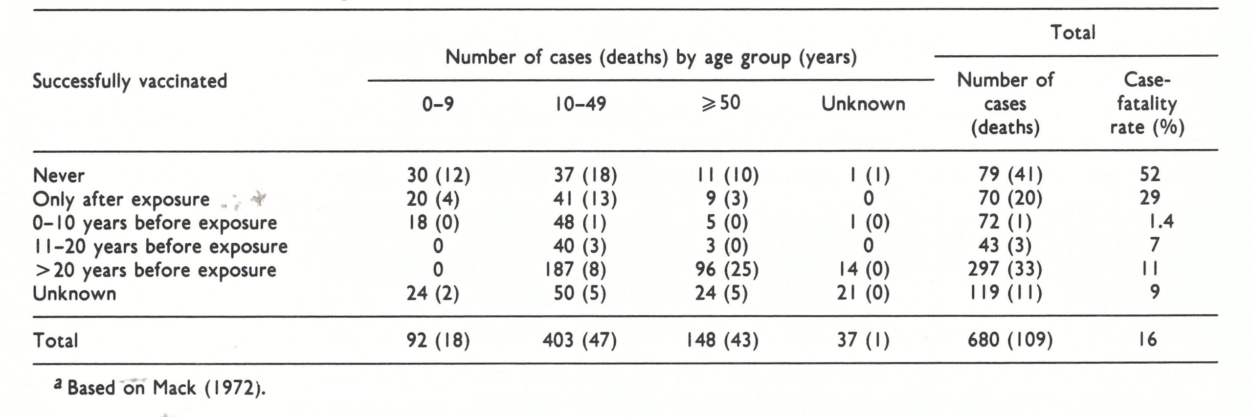 Hanna’s conclusions on the duration of protection against death provided by vaccination, in those who got smallpox, is confirmed by data collected by Mack (1972), who analysed 680 cases of variola major occurring after importations of the disease into Europe and Canada during the period 1950-1971 (Table 1 .12). The case-fatality rate was 52% in unvaccinated persons, 1 .4% in those vaccinated 0-10 years before exposure, and only 11 0 o in those vaccinated over 20 years before exposure. The contrast is even more striking if only the age group 10-49 years is considered a case-fatality rate of 49% in the unvaccinated and one of 4.3% in those vaccinated over 20 years earlier.
