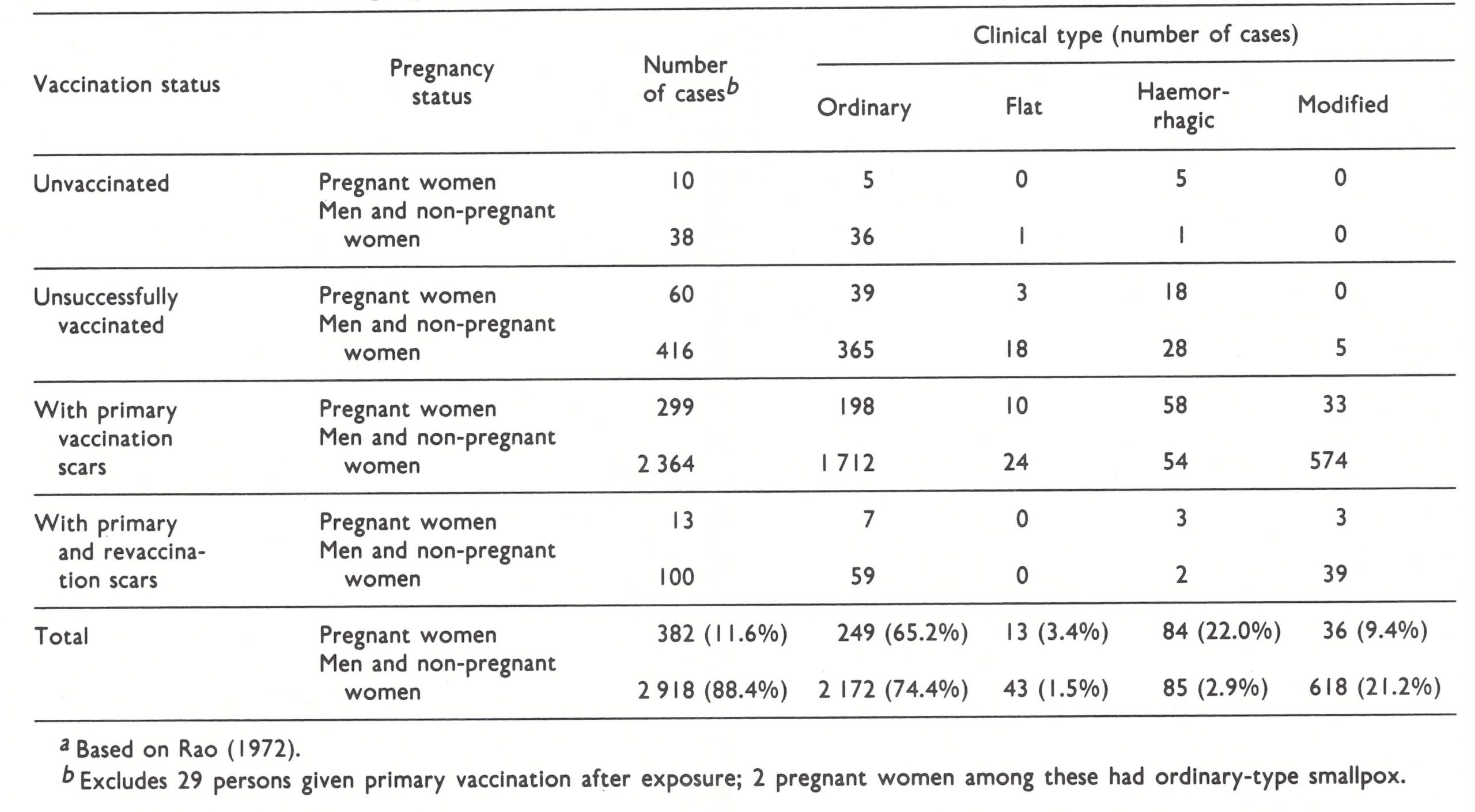 It is universally agreed that smallpox was more severe in pregnant women than in nonpregnant women or in men, irrespective of vaccination status. Table 1.14 sets forth the distribution of clinical types of smallpox in Rao’s series, in pregnant and non-pregnant women and in men in the age group 15-44 years, according to vaccination status. Although pregnant women constituted only 11.6% of the series, 50% of the cases of haemorrhagic-type smallpox occurred among them, mostly in women who had been vaccinated in infancy; indeed, almost one-quarter of all cases of smallpox in pregnant women were of the haemorrhagic type. Flat-type smallpox was over twice as common among pregnant women (3.4% compared with 1.5%) whereas modified-type smallpox was less than half as frequent (9.4% with 21.2%).