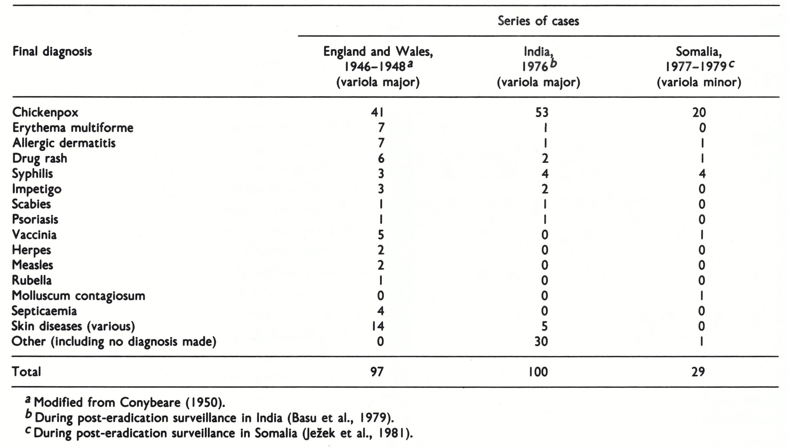 Several authors have summarized alternative diagnoses that have been made in suspected but unconfirmed cases of smallpox. Table 1.16 lists final diagnoses made in cases of suspected smallpox in situations in which variola major was the expected form of the disease (England and Wales, 1946-1948; India, 1976) and in those in which the endemic disease was variola minor (Somalia, 1977-1979). The overriding importance of chickenpox is apparent in all series. Marsden (1936) also reported that chickenpox was by far the commonest disease to be initially mistaken for variola minor in England (31 of 994 cases of suspected but unconfirmed smallpox). Other conditions suspected to be smallpox included almost all diseases that produced a rash.
