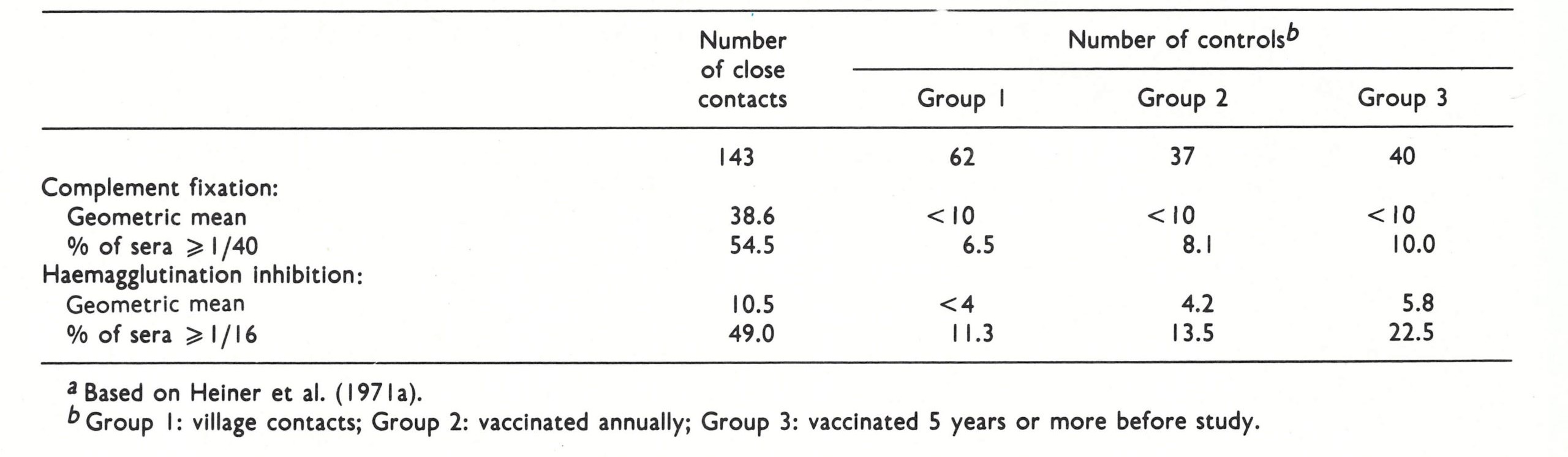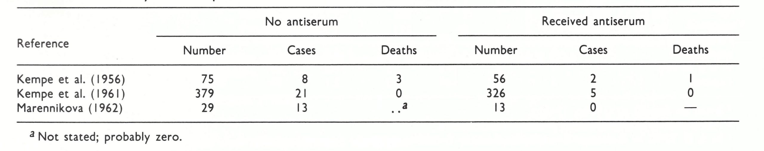 The most comprehensive trials were carried out in Madras (Kempe et al.,1956, 1961). Immune gamma-globulin, prepared from the serum of recently vaccinated adults (not smallpox convalescents) was administered to close contacts of smallpox cases, most of whom were also vaccinated or revaccinated at the same time. The results of these and other trials (Marennikova, 1962), summarized in Table 1.17, indicate that if given during the incubation period vaccinia-immune gamma globulin provided protection additional to that expected from vaccination at that time. The greater potency against variola virus of homologous antiserum from smallpox convalescents (Downie & McCarthy, 1958; Downie et al.,1961 b) might have been expected to give even better results, but no trials were ever made with such sera. In any case vaccinia immune or variola-immune gamma-globulin were available in such small quantities that they could only have been used in unusual situations. However, vaccinia-immune gamma-globulin did appear to have a place in the prevention and treatment of vaccination complications in some especially susceptible individuals (see Chapters 7 and 11).