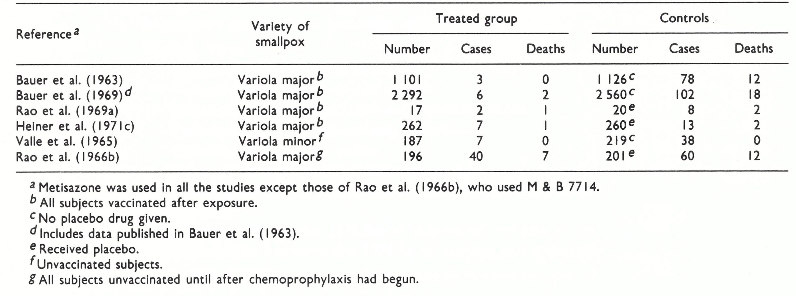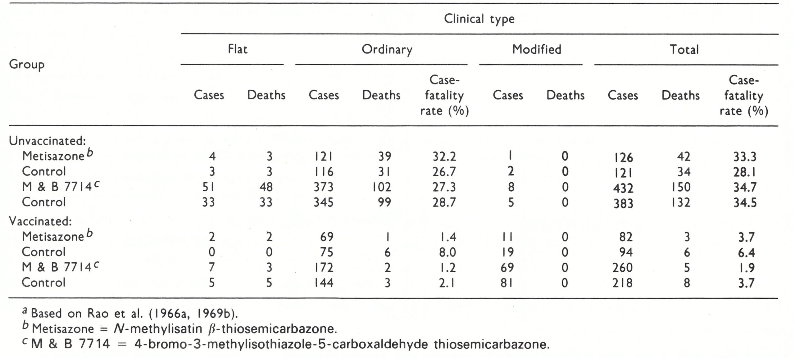 Both drugs were only slightly soluble and were given as tablets or as a micronized preparation in syrup. The main side effects were nausea and vomiting, which were sometimes severe. Rao et al. (1966a, 1969b) carried out double-blind trials of both thiosemicarbazones (Table 1.18). The only apparent differences between the treated and control groups were small reductions in the already low case fatality rates in vaccinated subjects. However, analysed, there were no significant differences in case-fatality rates between the unvaccinated treated subjects and the controls; nor were there any significant differences in symptomatology among the small number of cases of ordinary-type smallpox whom it was possible to treat as early as the 5th day of disease (2nd day of rash).