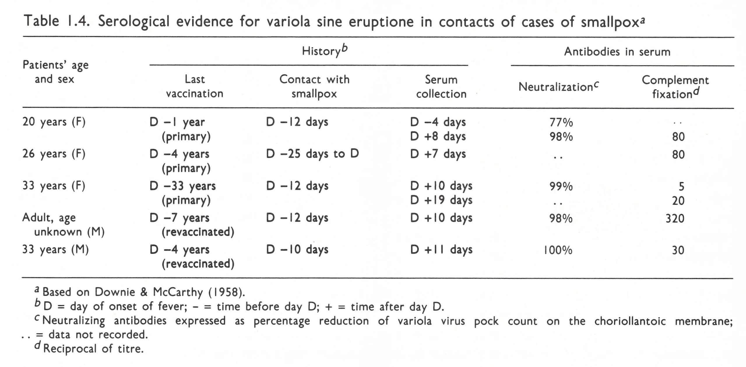 From the diagnostic point of view, it was important for physicians to appreciate that there was great individual variation in the extent to which vaccine immunity persisted. The person presenting with symptoms suggestive of flat-type smallpox, who had had a successful primary vaccination within 5 years, was unlikely to be suffering from this disease; the probability of another diagnosis should therefore have been seriously considered. On the other hand, the presence of signs or symptoms suggestive of a very mild attack of smallpox should not have led the doctor to discount the diagnosis even in the face of an apparently successful vaccination within a year. It was also important to remember that exceedingly mild smallpox, even variola sine eruptione, could occur in persons who had no evidence of ever having been successfully vaccinated.