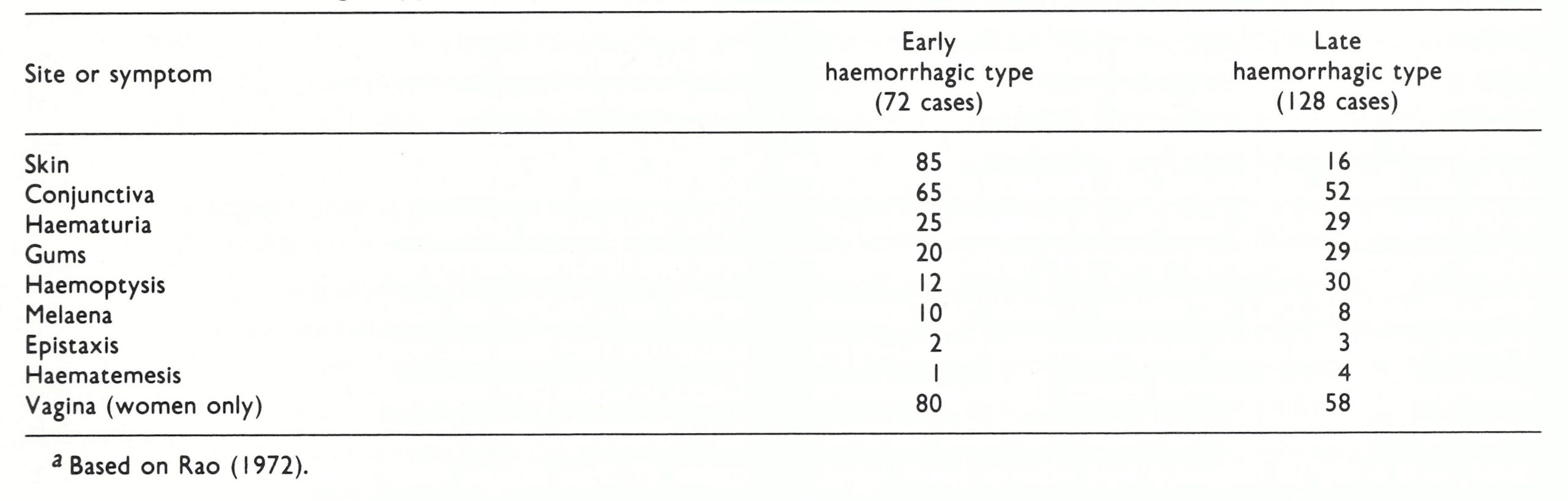 This was distinguished from confluent ordinary-type smallpox by an arbitrary criterion: the rash was confluent on the face but discrete on the body, including the forearms. A secondary fever often developed during the pustular stage, but the temperature and toxaemia were less marked than in the confluent subtype and the temperature subsided as soon as the scabbing had started. In Rao’s series the case-fatality rate in unvaccinated subjects was 37%.