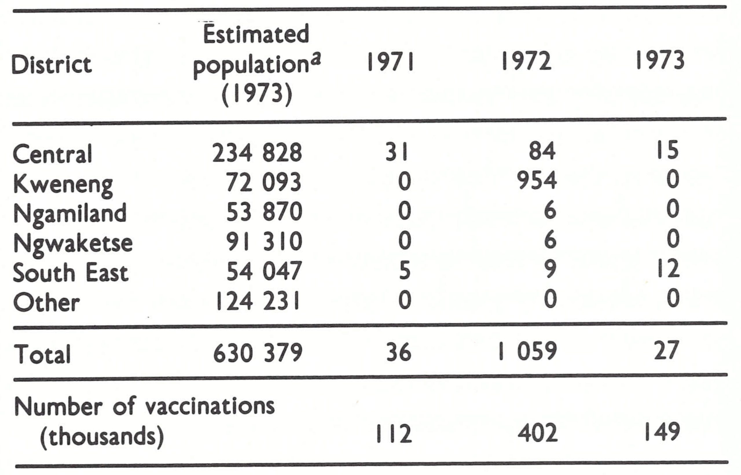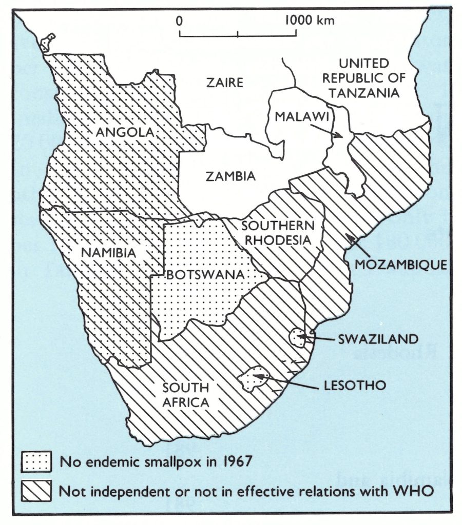 From February to August 1971, no cases of smallpox were reported to WHO from any country in southern Africa. Just when hope was growing that smallpox had been eliminated from this large area, cases began to be reported from Botswana, a hitherto smallpox-free country, adjacent to South Africa’s Transvaal Province. During the preceding 6 years, only a single imported case had been detected in Botswana. Vaccinial immunity throughout the country was low and smallpox began to spread. This was alarming. Not only might smallpox again become established in a country that had been free from it, but it was feared that it might spread through the populated areas in northwestern Botswana into areas of Angola which were inaccessible because of civil war. If smallpox were to become re-established there, the prospects for eradication would be significantly diminished. Effective measures to control the disease were greatly delayed but, by good fortune, it remained confined to Botswana, in which more than 1000 cases were recorded during 1972 and transmission persisted until November 1973.