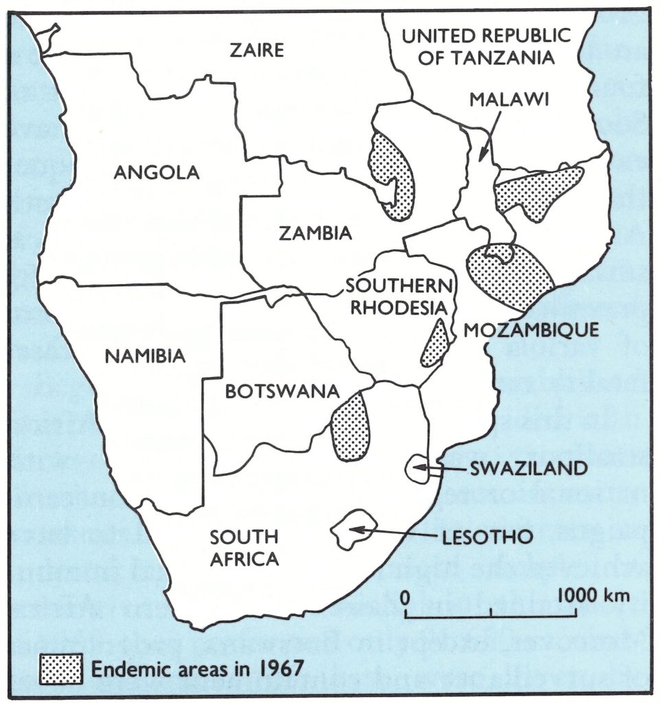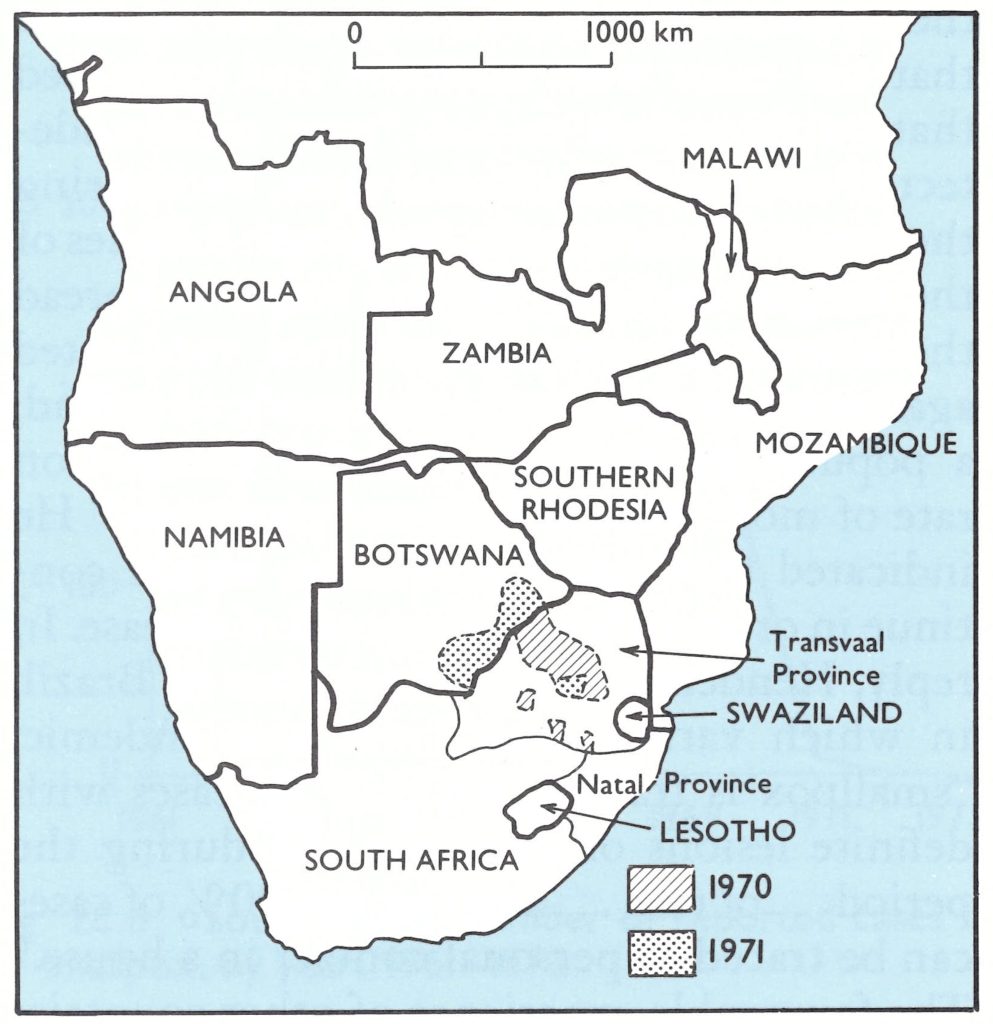 Fig. 20.7. Southern Africa: areas known to have had endemic smallpox, 1970-1971.