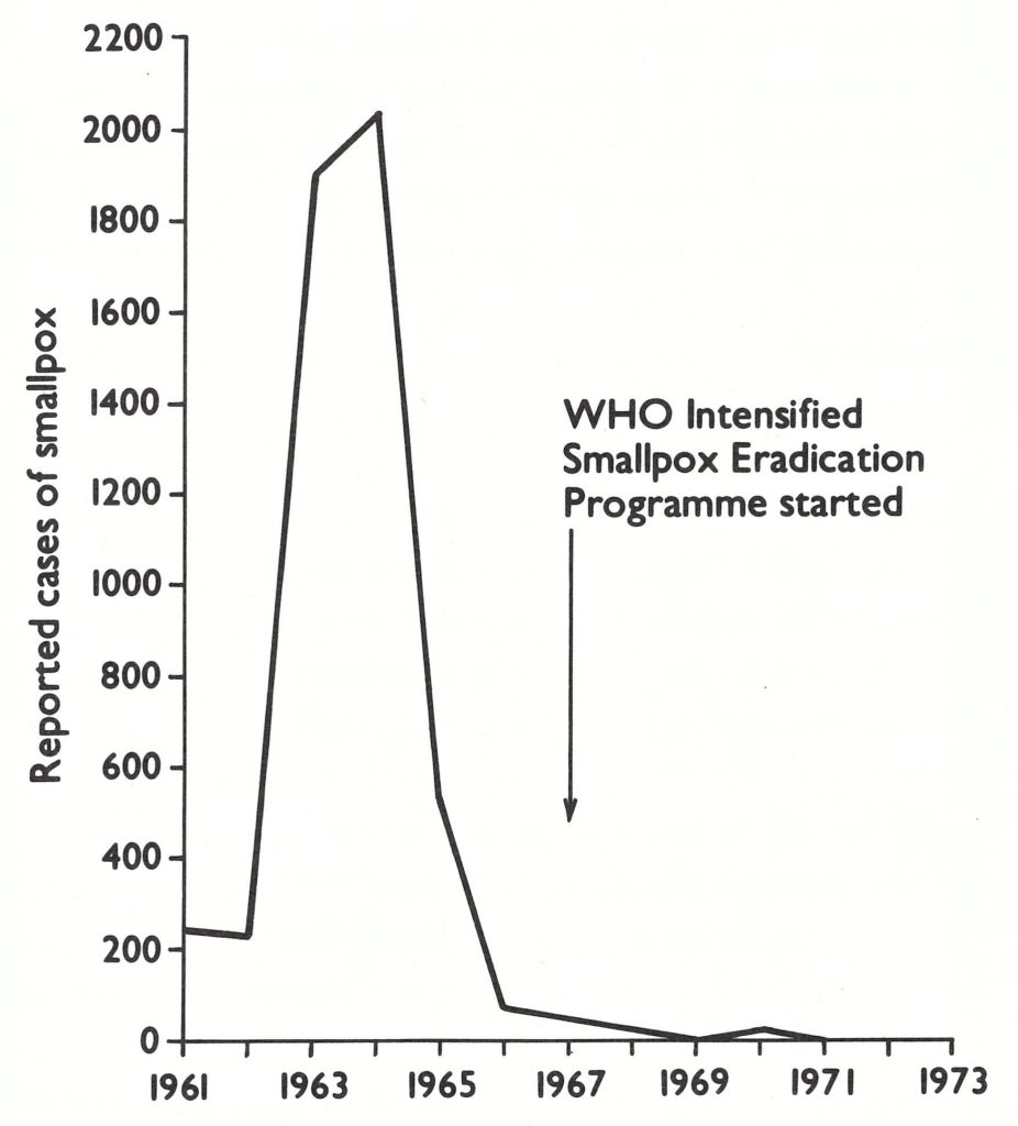 Only a few months later, neighbouring Botswana began to detect cases. Perfunctory control measures were taken but smallpox continued to spread. Not until May 1972, almost a year later, was an adequate programme begun. By then, the disease had spread widely across the country. Smallpox persisted in Botswana until November 1973.
