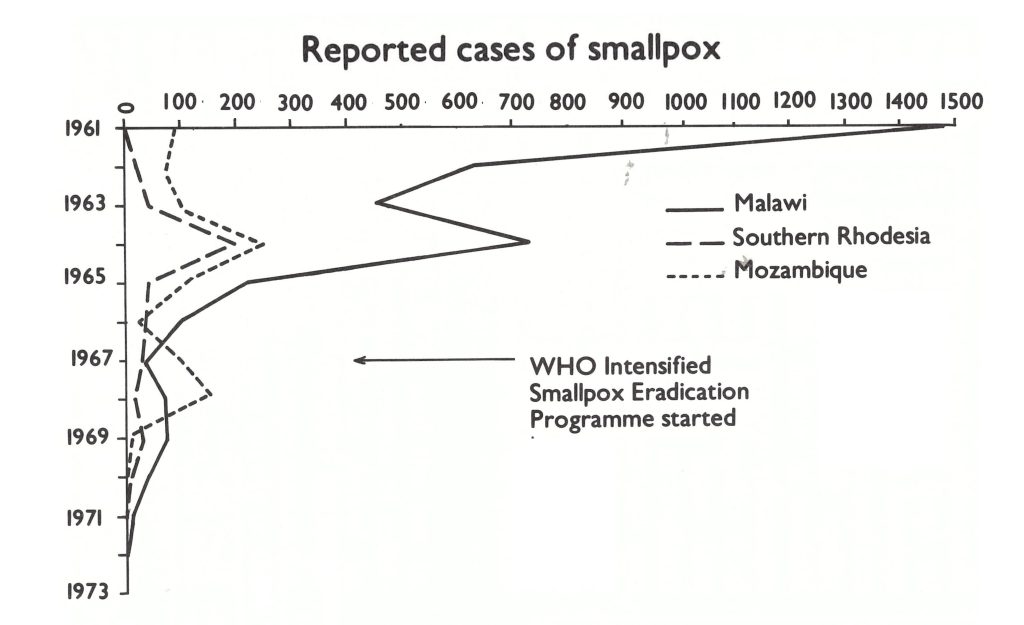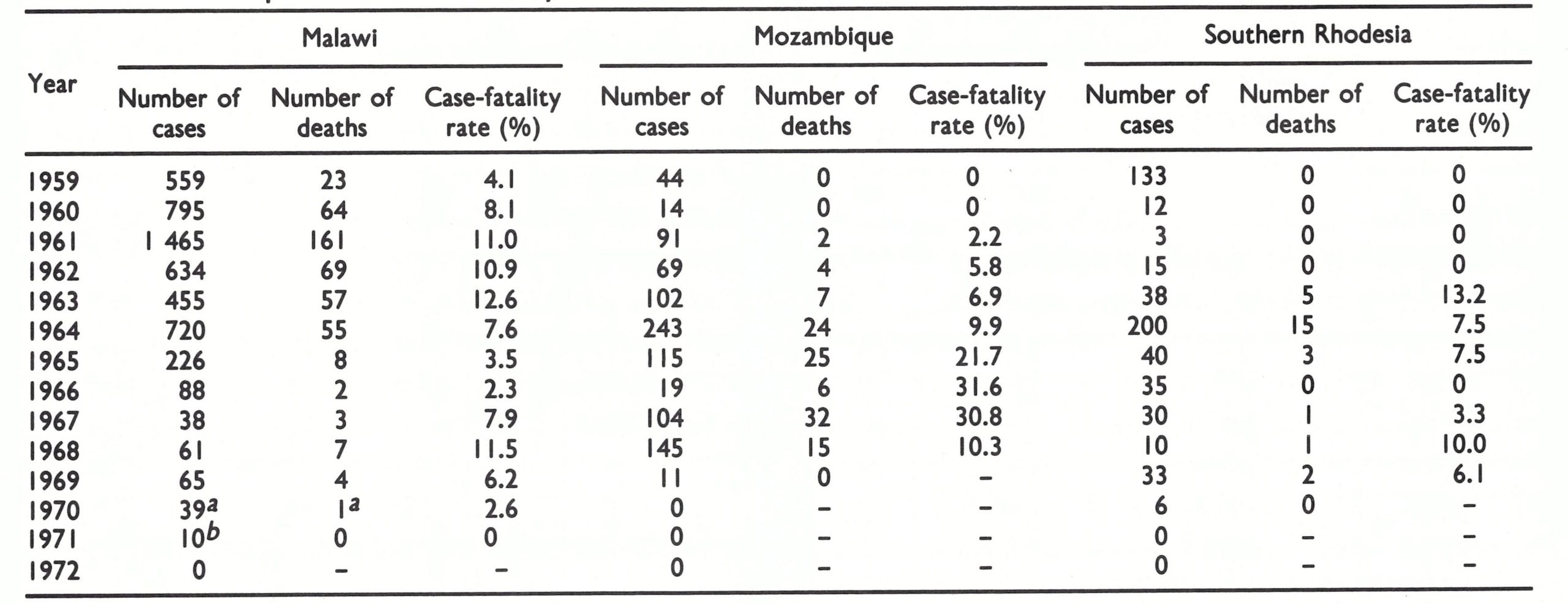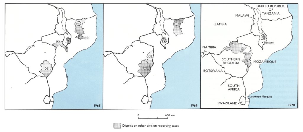 In the 3 countries under review, information about smallpox, from 1967 until 1971, when the last known cases were detected, is sketchy. Undoubtedly, many cases occurred which were not reported and some which were reported may not have been smallpox. Health authorities at district or provincial level in each country usually performed areawide vaccination when cases were reported but rarely did they conduct investigations to detect additional cases or to identify the source of infection. Ladnyi, during visits to Malawi, tried to persuade the government to initiate a surveillance programme, but not until 1973 was a satisfactory programme established for the investigation of suspected cases of smallpox. Since there could be no direct official communication between WHO and the health authorities in Mozambique and Southern Rhodesia, a similar effort to encourage proper surveillance in these areas was greatly delayed. At the end of 1969, some WHO staff began corresponding personally with university faculty members in Salisbury, Southern Rhodesia, who soon thereafter undertook to examine specimens from many suspected cases although few epidemiological investigations were conducted. Not until the spring of 1972 did WHO and the countries concerned reach agreement to give Henderson special permission to visit Mozambique (as well as Angola and South Africa although not Southern Rhodesia) to assess the nature of their programmes and to discuss needed surveillance measures in areas then believed to be smallpox-free. Information about smallpox, even that pertaining to the last outbreaks, is thus fragmentary in all the countries concerned.