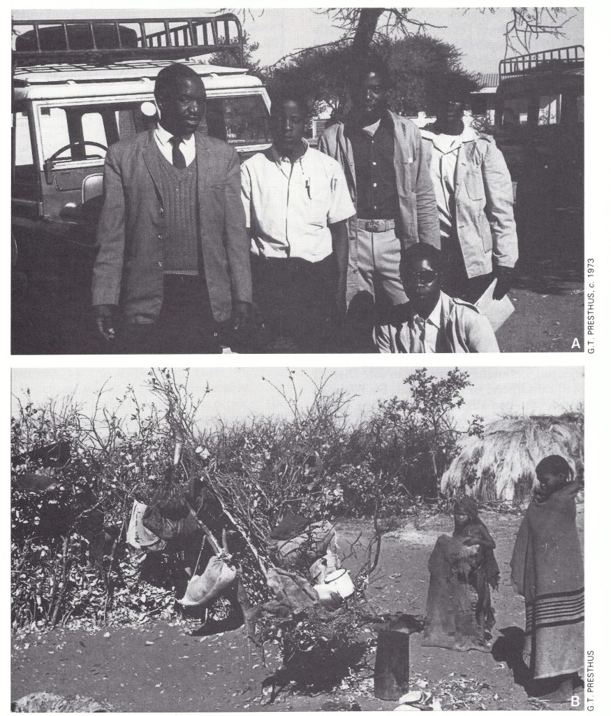 Plate 20.3. A: Joseph B. Sibiya (far left), Senior Health Inspector, with one of Botswana’s 4 surveillance teams. B: Many cases of smallpox were discovered in remote cattle posts in the Kalahari desert by the teams.