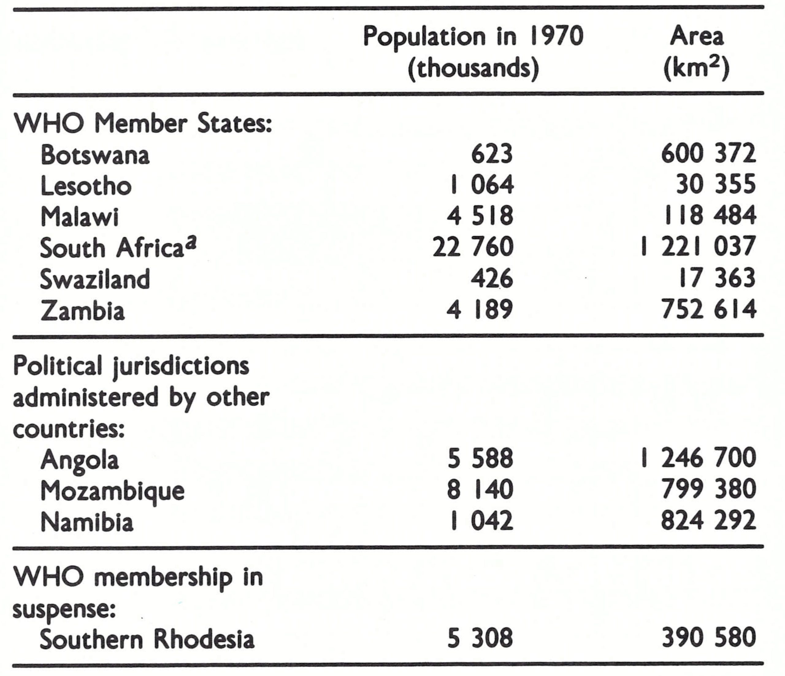 Given the status of smallpox and the national resources available in many of the countries, prospects for the early interruption of smallpox transmission throughout this vast area might have appeared hopeful. However, political problems made it difficult for WHO to cooperate with the authorities in large parts of southern Africa, and these constraints inhibited the programme. Only 4 countries, with a total population of 10.4 million (in 1970), were Member States of WHO with full voting rights (Table 20.1). A fifth, Swaziland, became independent in 1968 and joined WHO a few years later. Official contact between the Organization and the health authorities of the other 5 political jurisdictions, which had a total population (in 1970) of 42.8 million, was difficult at best and in certain cases practically nonexistent. Angola and Mozambique, both Overseas Provinces of Portugal until 1975, were preoccupied with a protracted and costly civil war. Contact with their health authorities had to be made through the government in Lisbon, for which smallpox eradication was an issue of little significance compared with other problems. Namibia (South West Africa) was administered by South Africa, which, though still a WHO Member State, had been deprived of voting privileges and services by the Seventeenth World Health Assembly in 1964 and which had subsequently ceased to pay its annual contribution or to attend the World Health Assembly. Communications between WHO and South Africa all but ceased at this time, along with South Africa’s participation in the Organization’s activities. Until 1965, Southern Rhodesia had been an Associate Member of WHO, being represented by the United Kingdom in its international relations. When the government unilaterally declared independence, its rights were suspended on the initiative of the United Kingdom. Communications between WHO and Southern Rhodesia had officially to be conducted through the government in London, but there was little or no official contact between the United Kingdom and the new government of Southern Rhodesia.