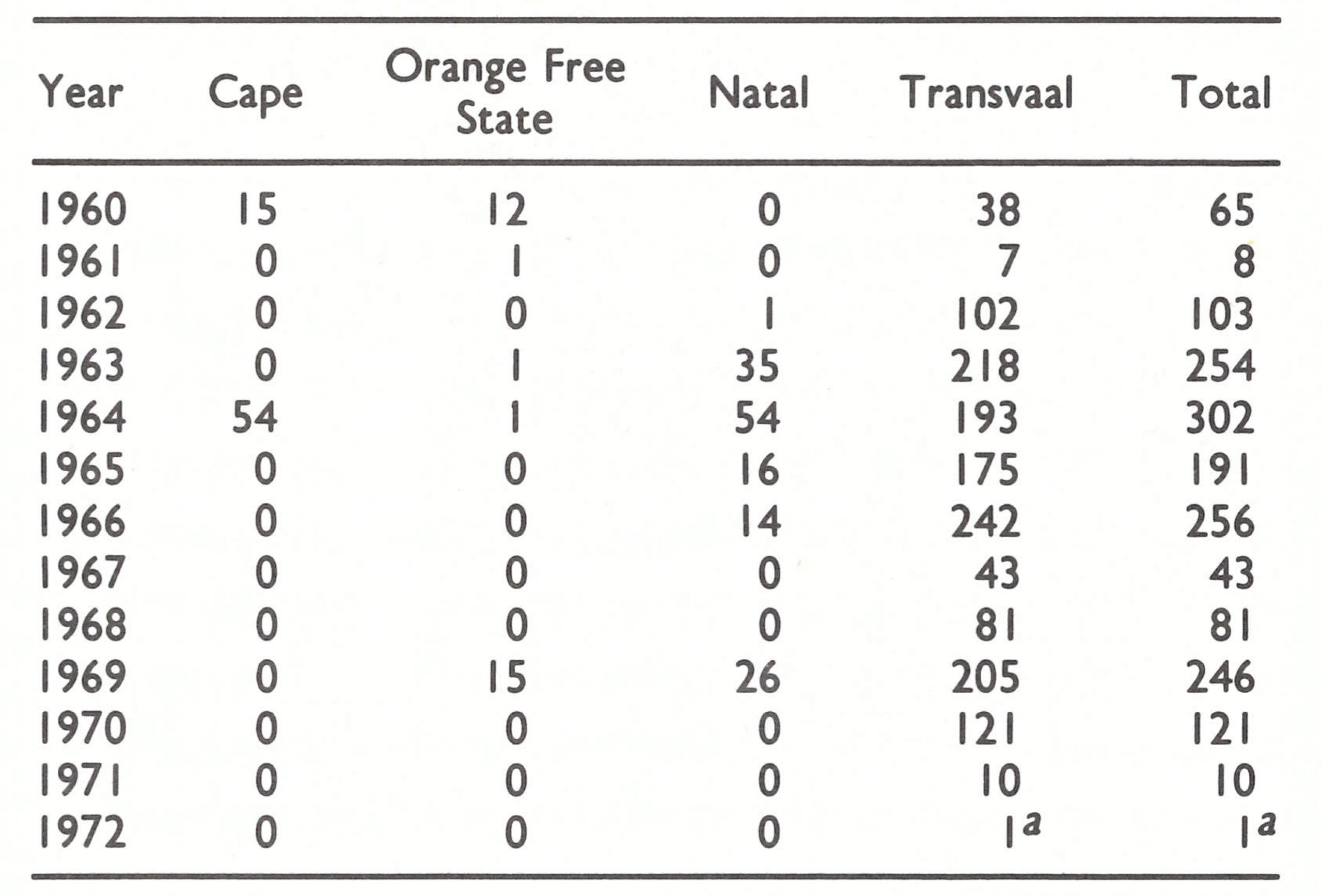 Until 1972, little information regarding the epidemiology of smallpox and the control programme in South Africa was available to WHO. That which was available was gleaned from a monthly infectious diseases bulletin published by the government and occasional reports of outbreaks sent to WHO by the Secretary of Health, in partial conformity with the International Health Regulations. Information regarding the geographical distribution of cases would have been helpful but the reports listed cases only by month and by racial group.