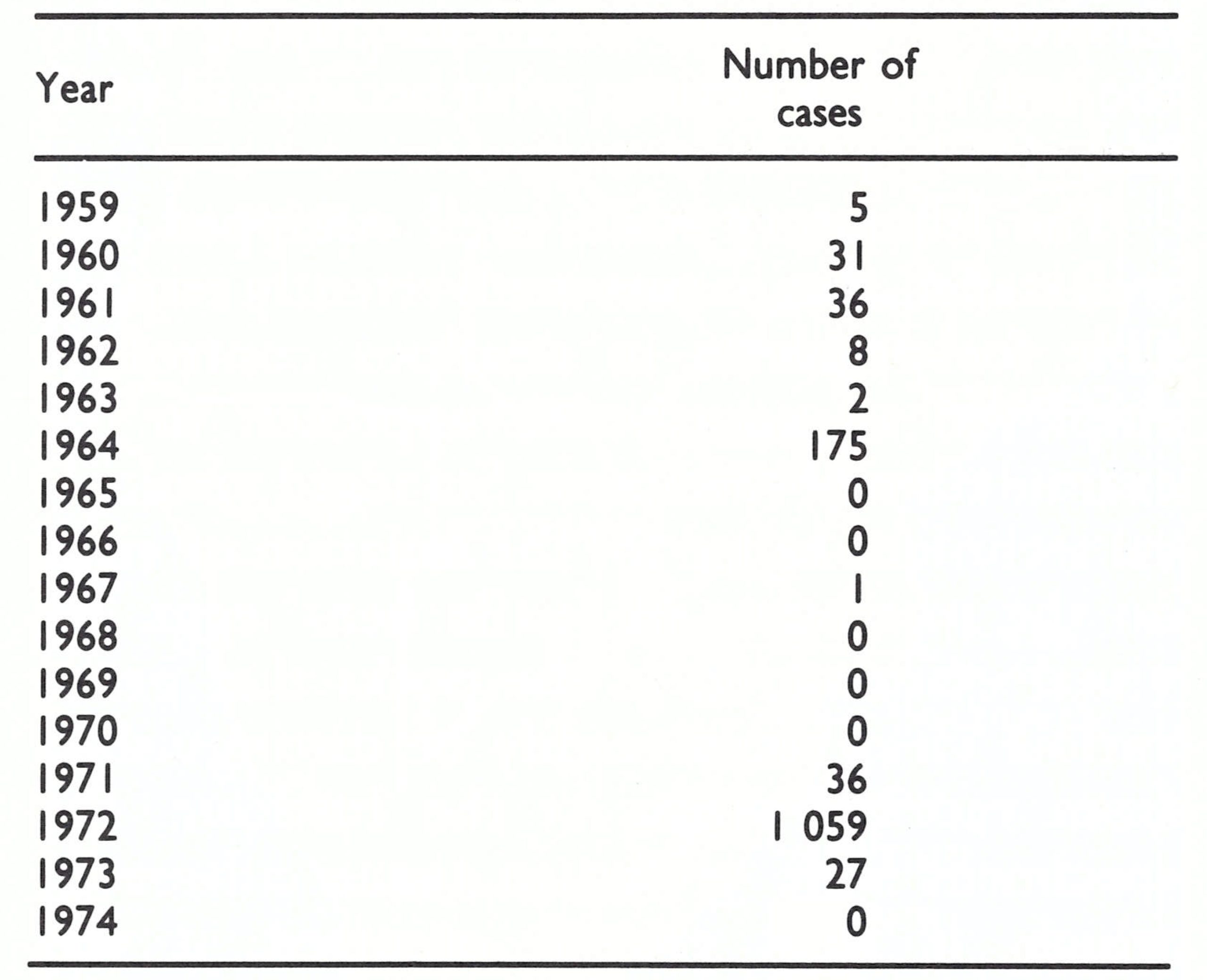 South Africa reported only 43 cases to WHO during 1967, and 81 cases in 1968 . Because so few cases were being reported in a country in which health services were so extensive, WHO had originally assumed that these cases must have occurred following importations and had provisionally classified South Africa as a non-endemic country.