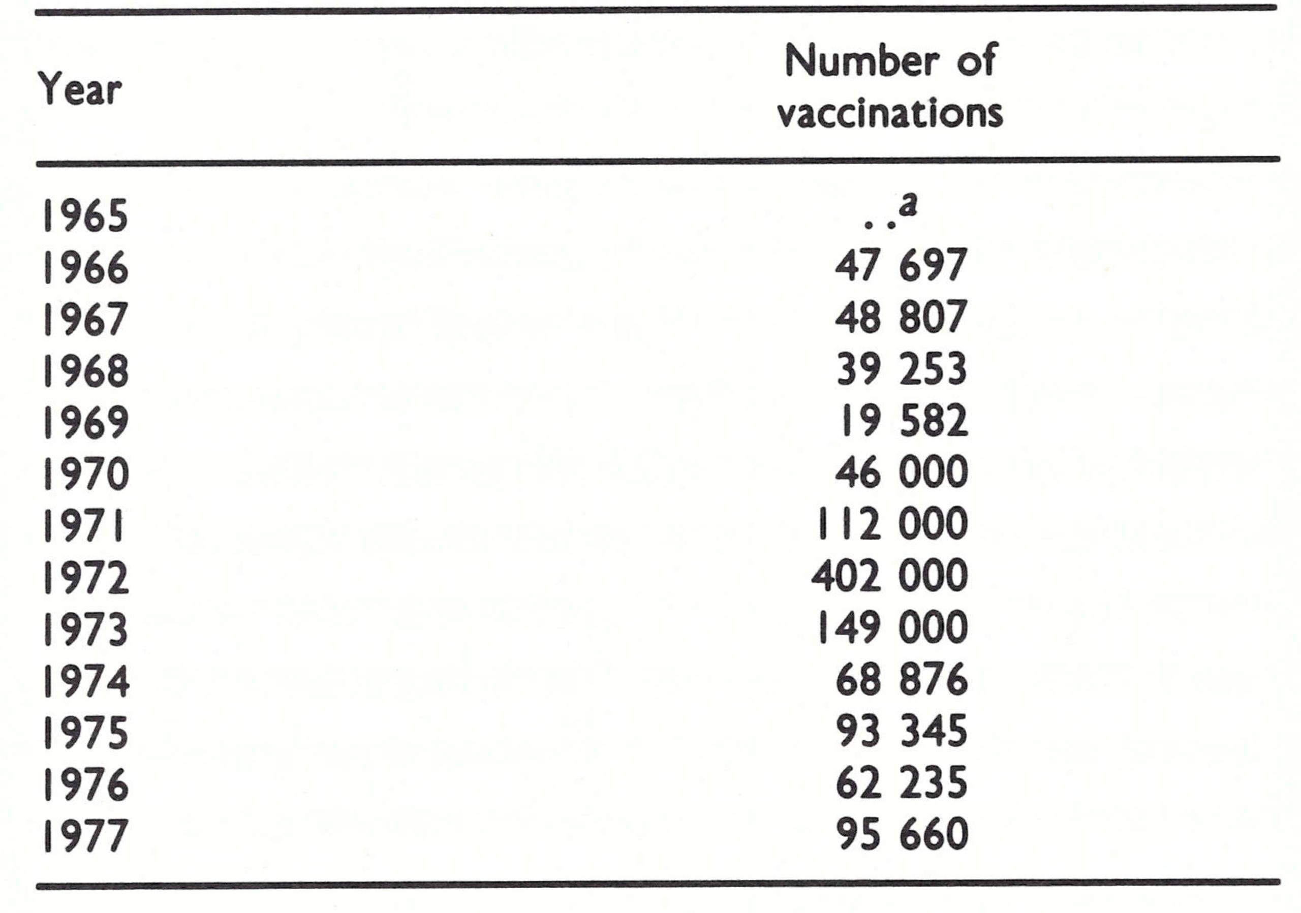 Beginning in 1968, the established government health units were provided with stocks of vaccine and encouraged to vaccinate all who attended but, as was true in many countries, these units evinced little interest in undertaking even this most simple of preventive measures. Throughout the whole of 1969, they performed only 91 650 vaccinations and many of these were given by programme vaccinators who were assigned to clinics. Fully 3 additional years of concerted effort were required before the staff of the health units began to vaccinate significant numbers of persons.