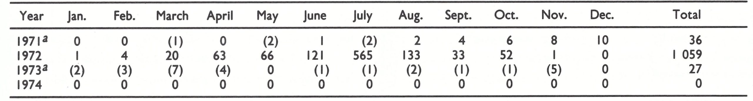 Field investigations conducted during March documented 36 cases which had occurred during 1971, the first in March near the South African border. Mr Presthus believed that there had been many more cases, but with new cases being detected daily there was no time to document further the previous year’s experience.