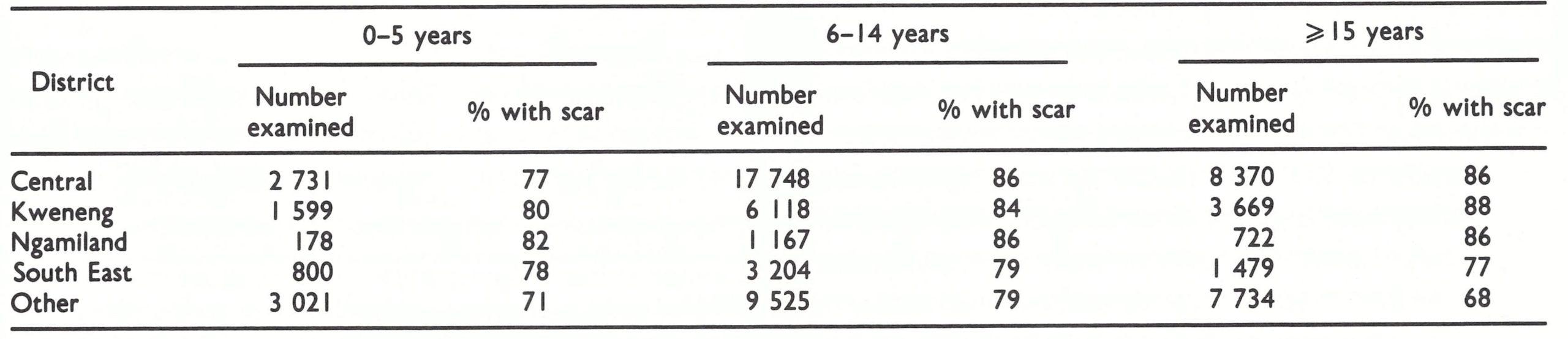 During 1970, at the midpoint of this repeat round of mass vaccination, a cluster sample survey of the country was carried out by staff of the WHO Epidemiological Surveillance Centre in Nairobi, Kenya, to measure the level of vaccination coverage. In all, 17 927 persons were examined. The proportion with vaccination scars was found to range from 62% to 80 % in the different provinces, but in 5 of the 44 districts it was discovered that fewer than 60% of the people had ever been vaccinated. By any standard, the programme had not been notably successful.