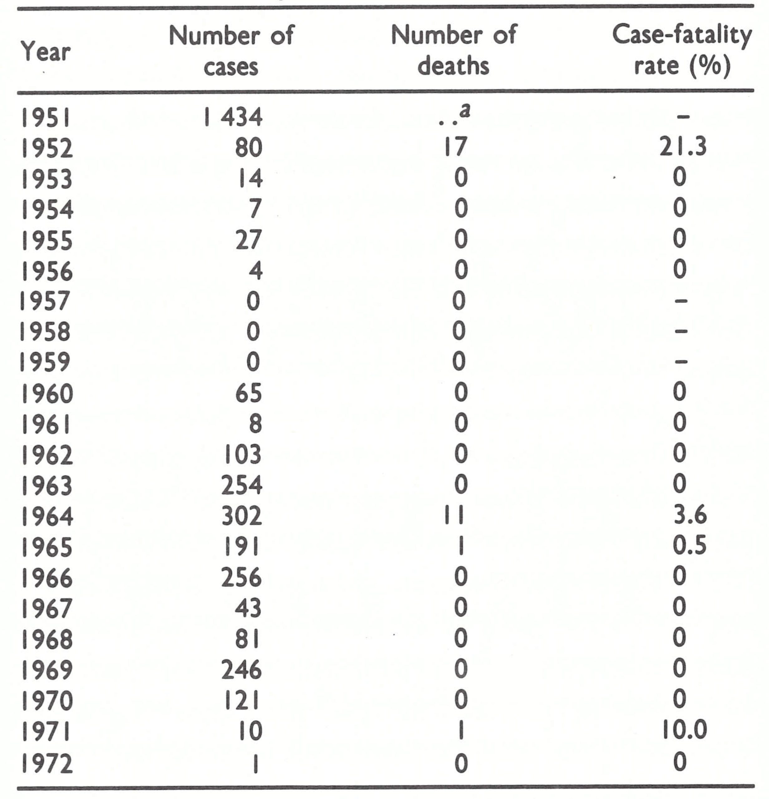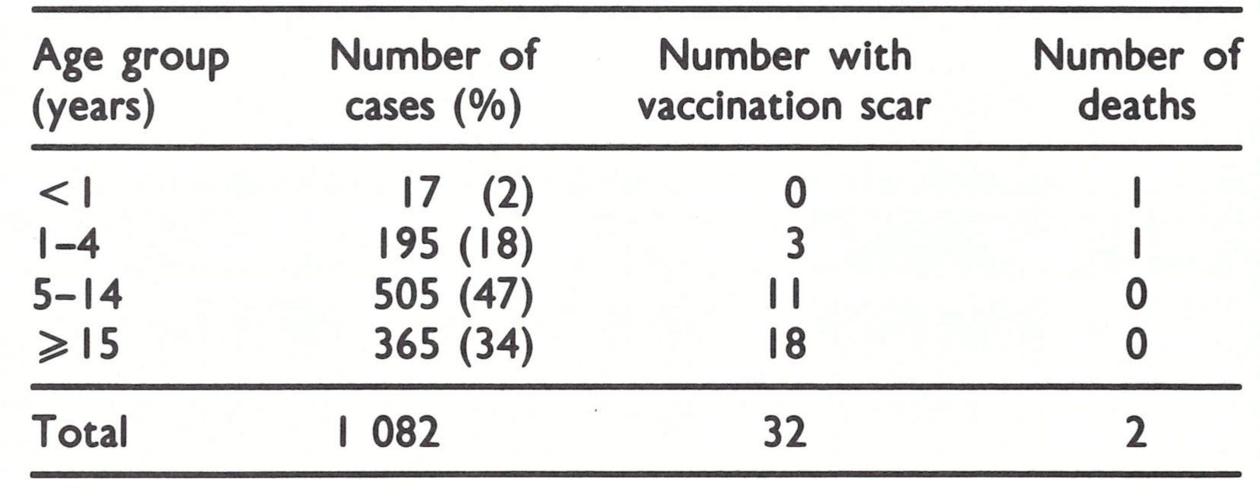Smallpox, with a case-fatality rate of 5-15%, similar to the form existing in neighbouring Zaire, had been prevalent for many years (Table 20.2). Mass vaccination campaigns employing liquid vaccine were conducted during periodic outbreaks.