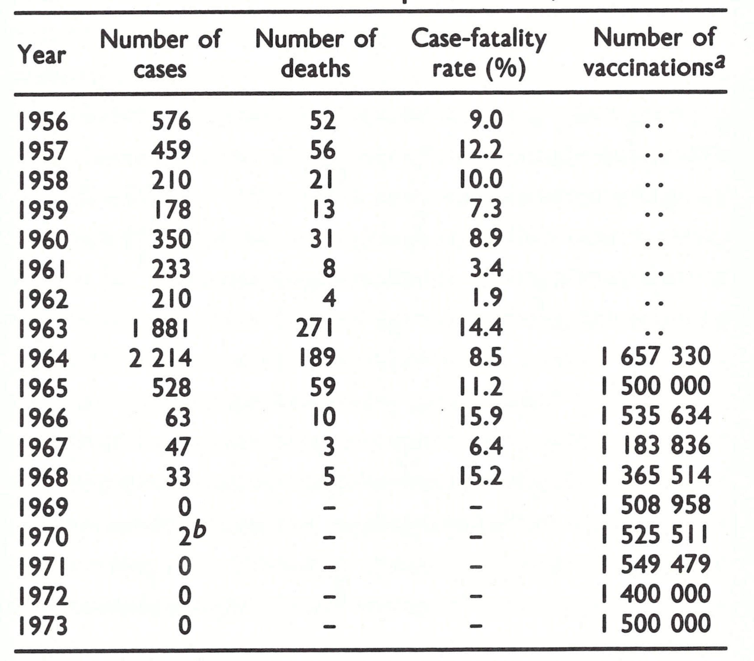 Finally, in 1974, an extensive vaccination campaign began, long after the last cases had been detected1. It concluded in 1976. WHO financial support throughout the course of the programme amounted to US$311 011; in addition, 7.8 million doses of vaccine were supplied.