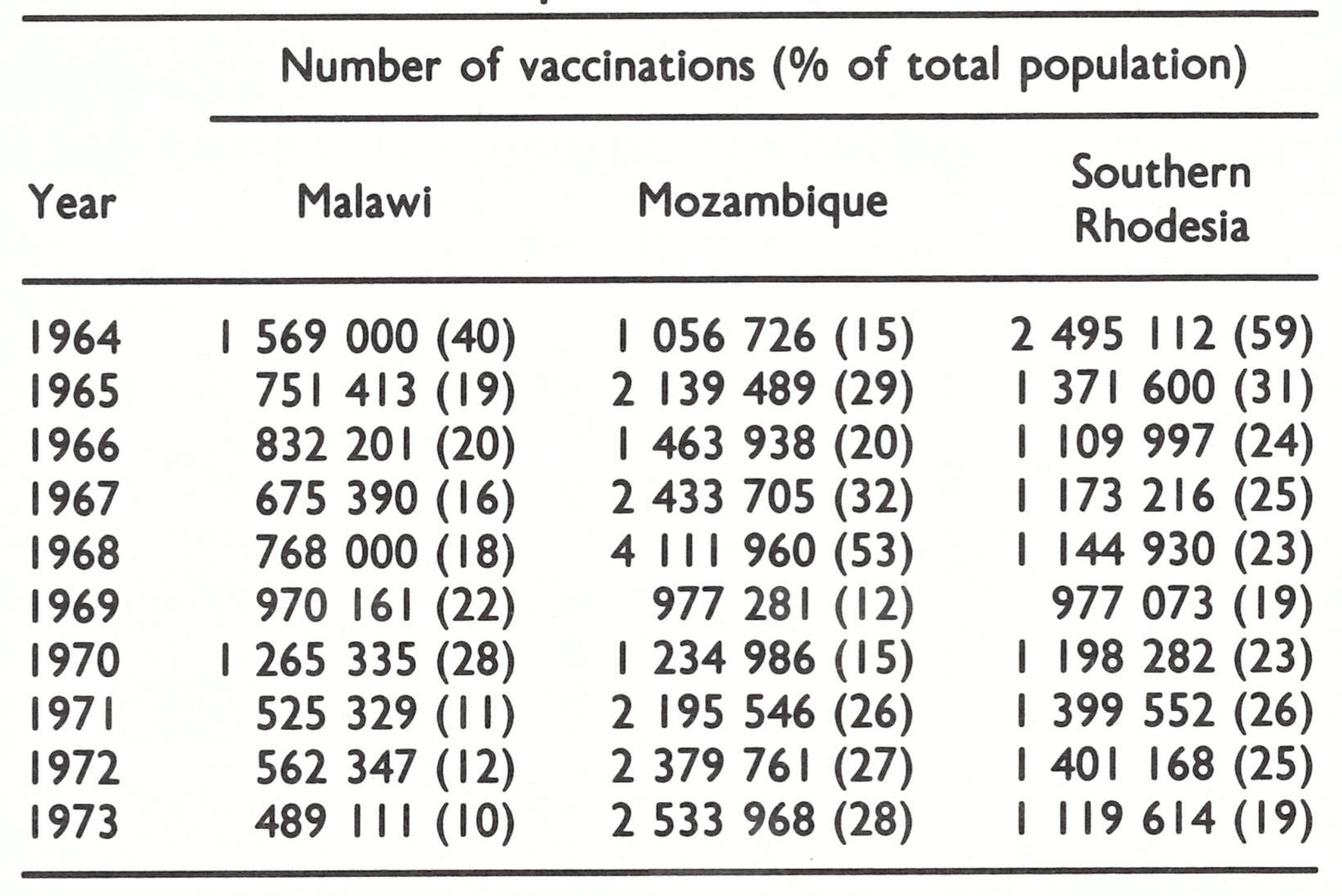Continuing vaccination campaigns employing liquid vaccine produced in South Africa had been in progress in each of the countries for many decades. The programmes were intended primarily to prevent largescale outbreaks of variola major should it be reintroduced rather than to control the relatively innocuous variola minor, against which the vaccine also provided protection.