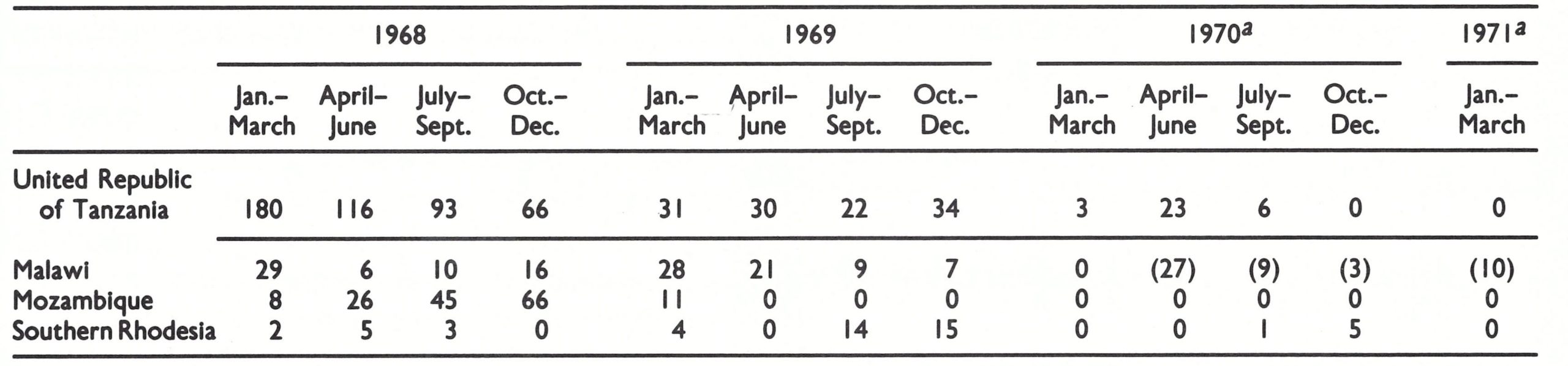 Mozambique detected 104 cases in 1967, 145 in 1968 and 11 in 1969 (the last occurring in February) (Fig. 20.4). Of the 145 cases in 1968, 142 were reported from parts of only 3 provinces, all in the north of the country (Fig. 20.5). Most of the outbreaks occurred in villages in Tete District, near the border with Malawi, and in Niassa District, which adjoined endemic areas in the United Republic of Tanzania. The 11 cases detected in 1969 were all in Niassa District. Because the guerrilla forces of the independence movement continued to travel between Niassa and the southern part of the United Republic of Tanzania, it is possible that these foci were related. This is speculation, however, since in neither country were outbreaks investigated to determine their sources. Few smallpox cases were reported in the south of the United Republic of Tanzania after 1969 but it later border areas of Malawi and Southern Rhodesia, at least until the end of 1970. In Mozambique, however, no further cases were detected after 1969. Because security in many of the border areas was problematic, cases may well have occurred but remained undetected.