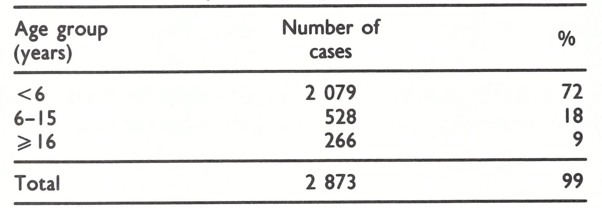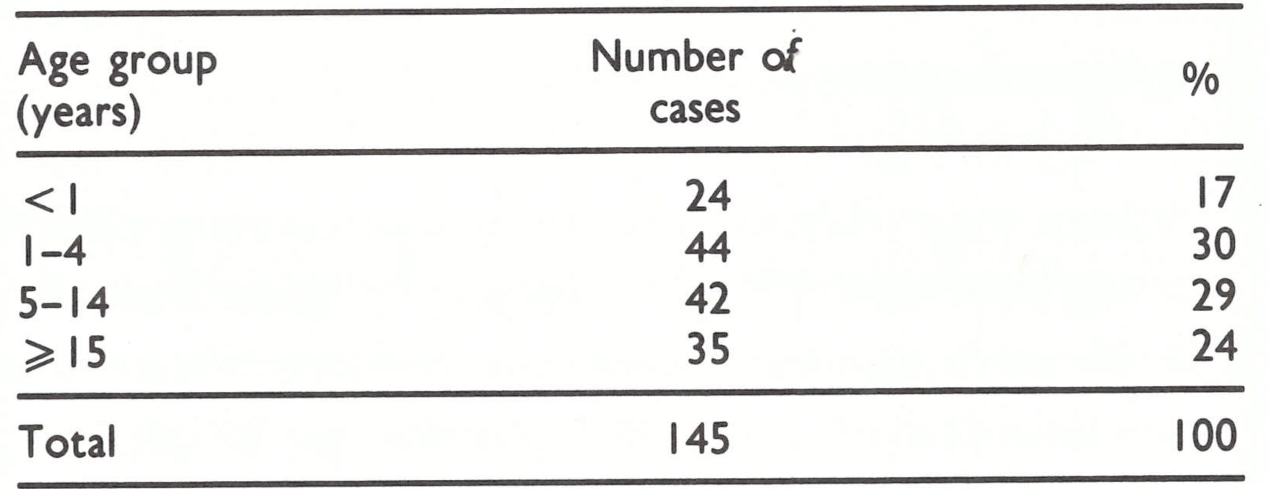 The age distribution of cases during 1964- 1965 was unusual in that 86% of those recorded were in individuals aged less than 6 years (Table 20.3). This was an unusually high proportion of cases among young children, for which there is no explanation other than that it may have been an artefact of reporting. Data for the 1966-1968 period show a more typical age distribution of cases.