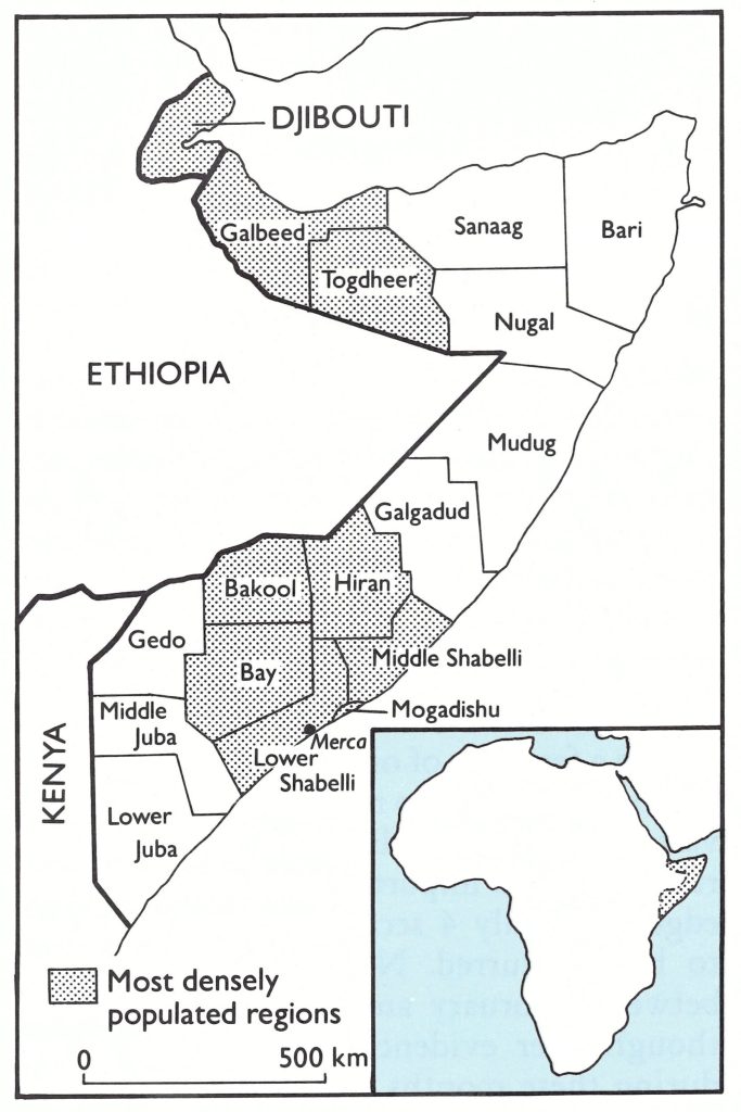 Fig. 22.1. Somalia: Regions and adjacent countries. Before attaining independence in 1977, Djibouti had been the French Territory of the Afars and the Issas