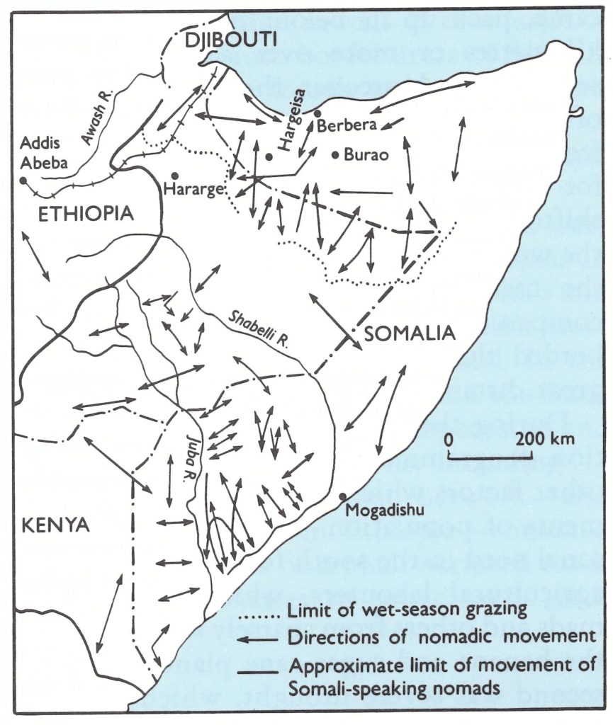 Fig. 22.2. Horn of Africa: approximate area covered by movements of Somali-speaking nomadic pastoralists.