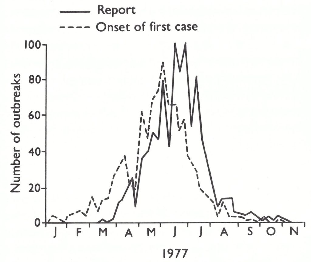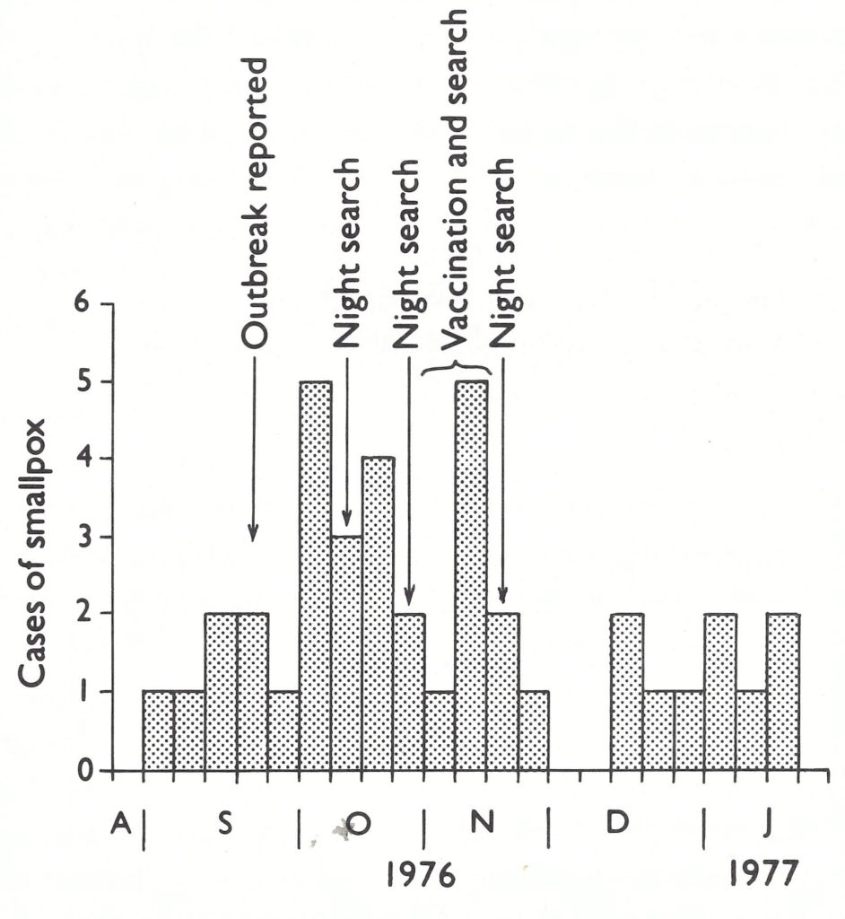 Since 1969 Somalia had been engaged in a WHO-assisted programme of smallpox vaccination and surveillance which national programme staff believed to be highly successful. As late as August 1975, the national programme director, in a meeting with Ethiopian staff at the border of the two countries, reported that 85% of the population had been successfully vaccinated. Although importations of smallpox had been frequent, most of the cases were said to have been detected within a few days of onset. They had occurred among nomads, who roamed freely across the vast Ogaden desert. Between 1972 and February 1976,38 imported cases were acknowledged but only 4 secondary cases were said to have occurred. No cases were reported between February and September 1976, although later evidence suggests that it was during these months that endemic smallpox became reestablished. In September, Somalia’s report of smallpox cases brought the prompt assistance of experienced WHO epidemiologists. These staff members were handicapped by not being permitted to visit the sites of outbreaks or to travel widely in search of cases, but with their Somali counterparts they struggled to interrupt what seemed to be a few tenuous chains of transmission in Mogadishu, the capital. By January 1977, it appeared that they had succeeded. However, a country-wide search for cases was called for, and in March the government agreed to cooperate fully in making this possible. The search soon revealed that endemic smallpox extended throughout southern Somalia. Major epidemics followed, and in May the government declared an emergency.