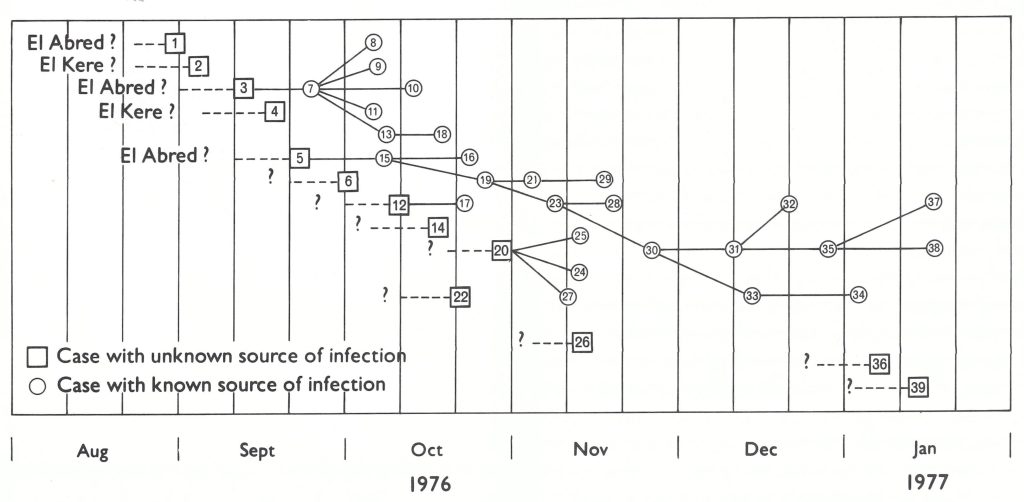 Dr Stanley Foster, formerly a senior WHO smallpox adviser in Bangladesh, with Mr Abdul Gadir El Sid, previously with the eradication programme in the Sudan, painstakingly documented the movements of one group of 44 nomads from June 1976 to the end of August 1977 (Foster et al.,1978). During this period, the nomads ranged over an area of about 70 kilometres by 35 kilometres (see illustration below). Only 7 members of the group had previously been vaccinated. In February 1977, the first case of smallpox occurred. The disease spread slowly among the group with only 1 or 2 cases in a generation of transmission. In all, 19 cases occurred over a 5-month period.