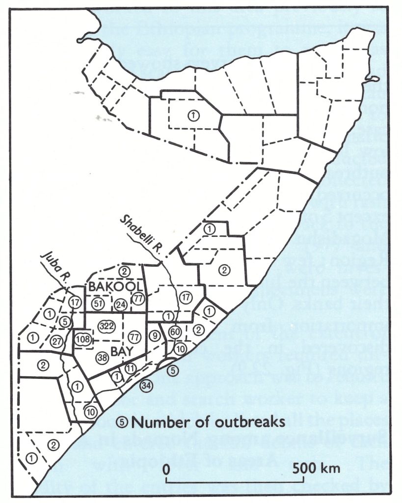 By late August surveys showed that 77% of the settled population and 70% of the nomads knew of the reward for reporting a case, and the epidemic had subsided to very low levels. At the end of October the last outbreak was contained. In all, 3229 cases had occurred in 947 different outbreaks. All except 5 of the cases during 1977 were outside Mogadishu. Most cases occurred in the Bay Region; few were detected outside the area between the Juba and Shabelli rivers or along their banks. Only 1 outbreak, a documented importation from southern Somalia, was discovered in the country’s 6 northern regions (Fig. 22.9).