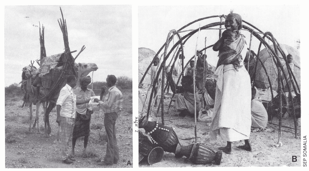 Plate 22.1. The unpredictable movements of Somali nomads made the search for cases difficult. Their huts were easily carried on camel-back (A) and quickly erected (B).
