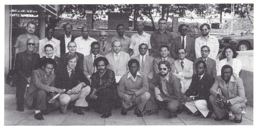 Plate 22.8. Participants in the second intercountry coordination meeting, Nairobi, 26- 28 September 1977. Left to right, front row: Girma Teshome (Ethiopia), R. 0. Hauge (WHO), Tesfaye Temelso (Ethiopia), Unidentified participant, M. A. Strassburg (WHO), D. W. 0. A h a (Kenya), Unidentified participant; middle row: E. Shafa (WHO), B. O’Keefe (Kenya), I? Chasles (WHO), W. Koinange (Kenya), I. D. Ladnyi (WHO), B. Teelock (WHO), I. Arita (WHO), C. Algan (WHO), Z. Islam (WHO), N. C. Grasset (WHO); back row: 2. Jezek (WHO), I. 0. Mwatete (Kenya), Yemane Tekeste (Ethiopia), M. Dutta (WHO), M. K. Al Aghbari (WHO), A. H. El Sayed (Sudan), A. Deria (Somalia), M. N. El Naggar (WHO), M. A. Gure (Somalia), V.J. Radke (WHO).