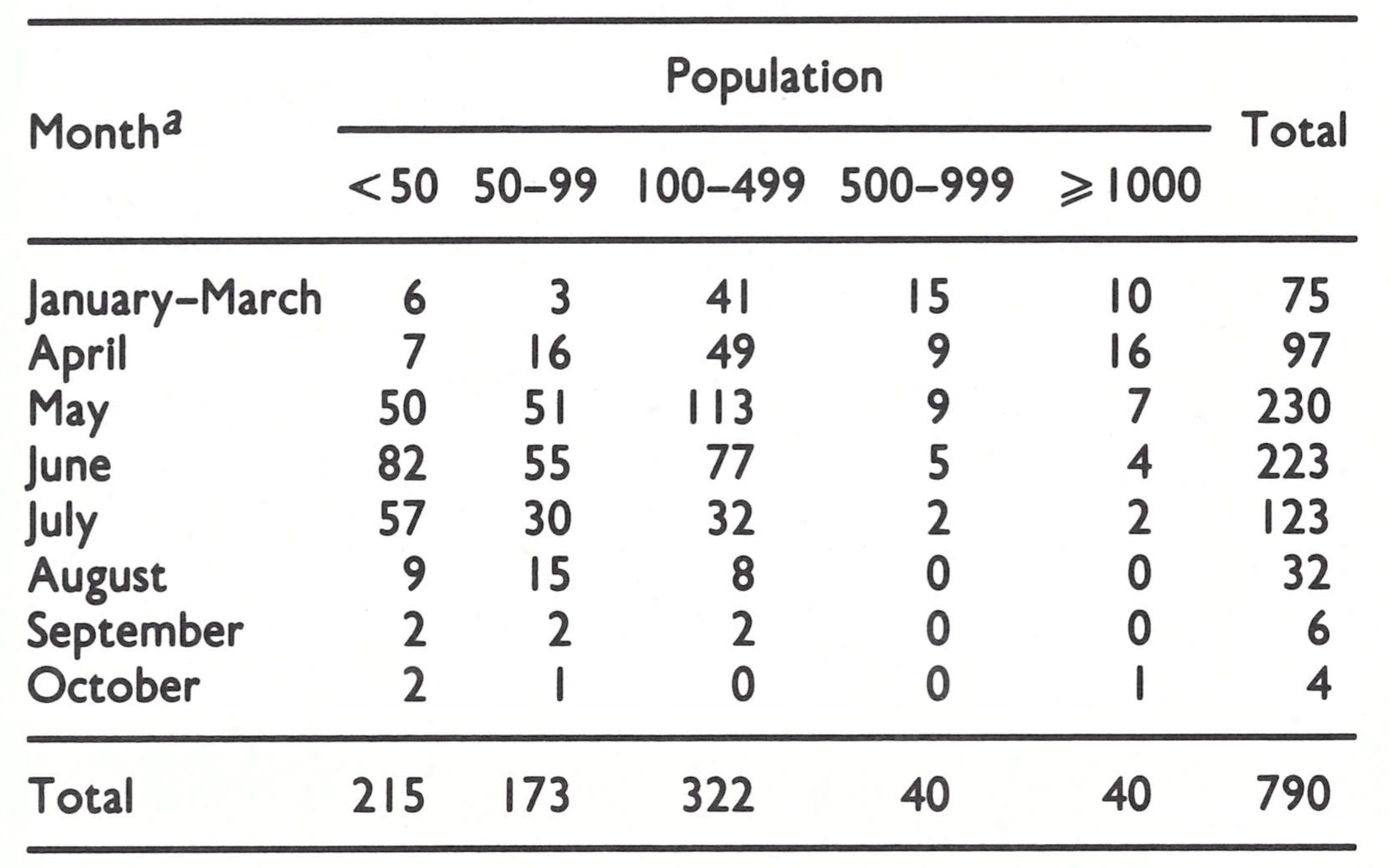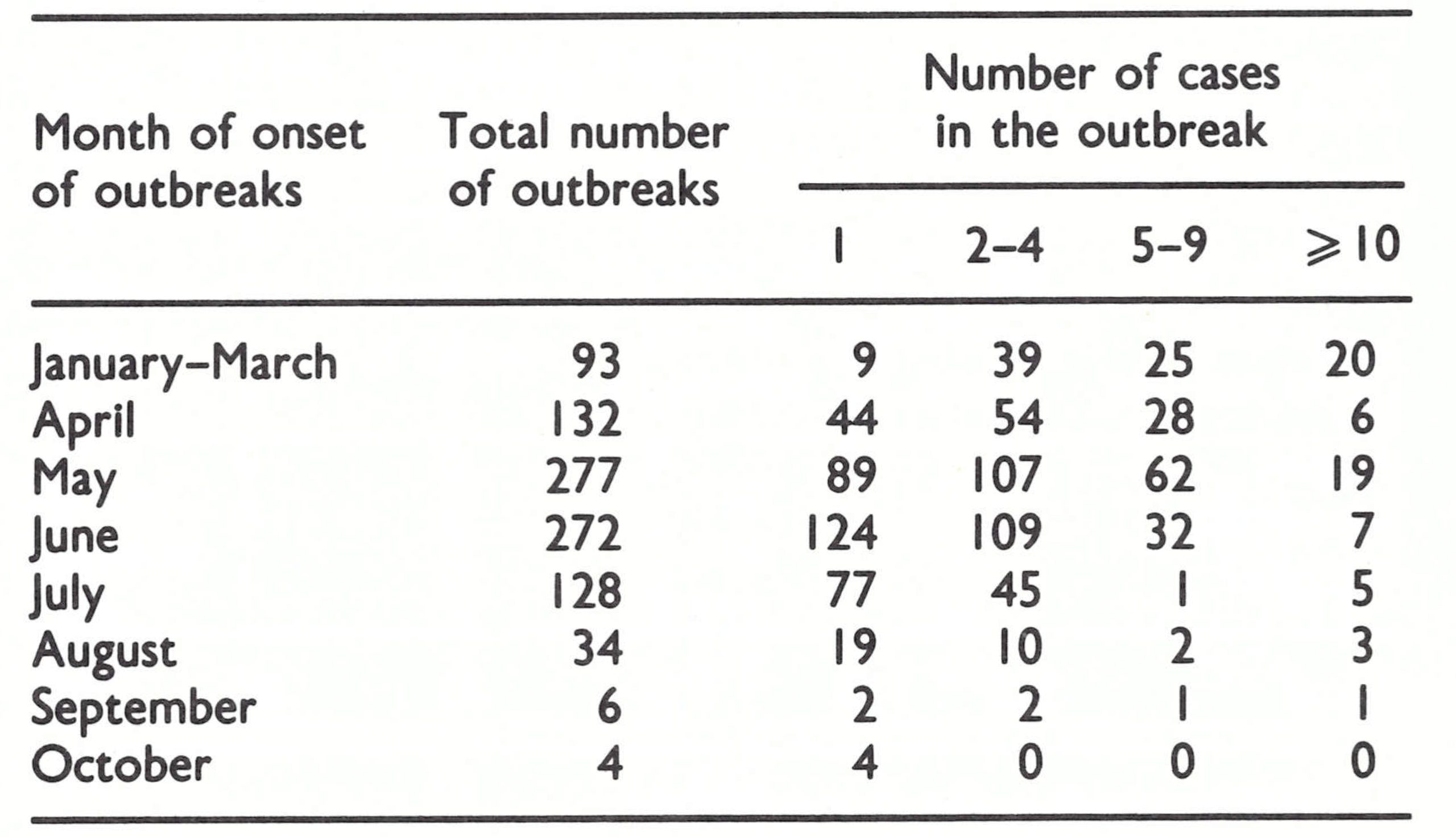 Table 22.9: Somalia: distribution of smallpox outbreaks, by size and month, 1977