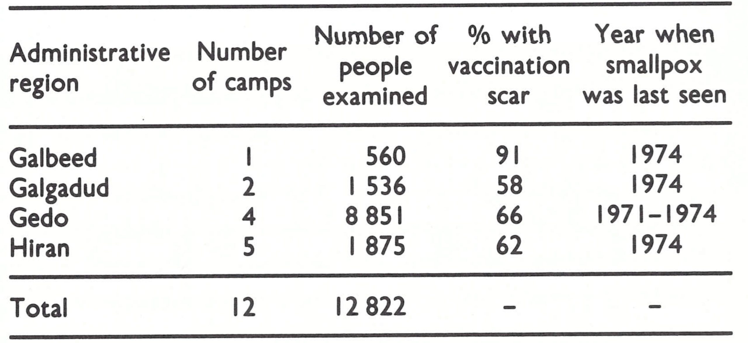 Somali programme teams assisted by 2 WHO advisers endeavoured to find the source of infection of the 5 cases and, still believing that it was in Ethiopia or along the Somali side of the border, undertook a 3- day search in border areas in Somalia, from 3 to 6 October 1976, but discovered no cases. They reported that 80-90% of the villagers whom they saw had vaccination scars. A more intensive search was deemed necessary, and 32 staff and a WHO epidemiologist, provided with 4 vehicles, were assigned to the task. The search began on 9 October and was completed on 2 November. It ranged over an area about 500 kilometres long by 100 kilometres wide but revealed no cases. In all, some 12000 persons were seen in approximately 30 different villages ;74% had vaccination scars. Of 1200 nomads seen at watering-places, 68% had previously been vaccinated. All denied having seen cases of smallpox for 2 years or more.
