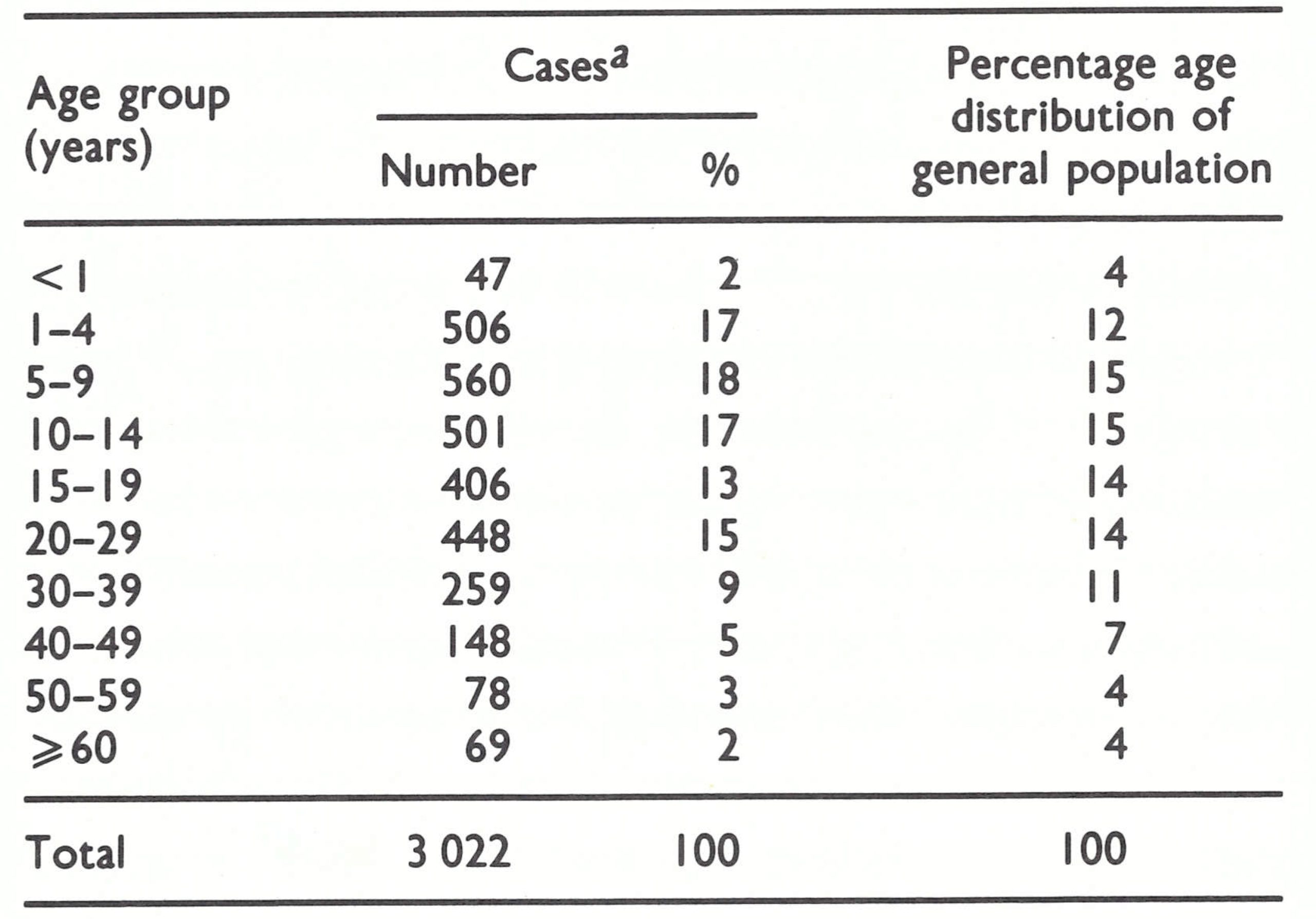 Data on the age of onset and outcome of illness are available for 3022 of the 3229 cases that occurred in Somalia in 1977. The age distribution of cases is especially interesting in that it parallels closely the age distribution of the population at large (Table 22.12). This finding might be expected in a population with little immunity either from smallpox or from vaccination. As has been noted previously, most cases occurred among nomads whose vaccinial immunity was not more than 10-20% when the epidemic began, and although the level of vaccinial immunity rose to more than 90% by September 1977, most cases had already occurred by then. Facial pockmark surveys conducted in 1978 revealed that for most southern Somali nomads smallpox was a new experience, the last large outbreaks having occurred in 1938, nearly 40 years earlier.
