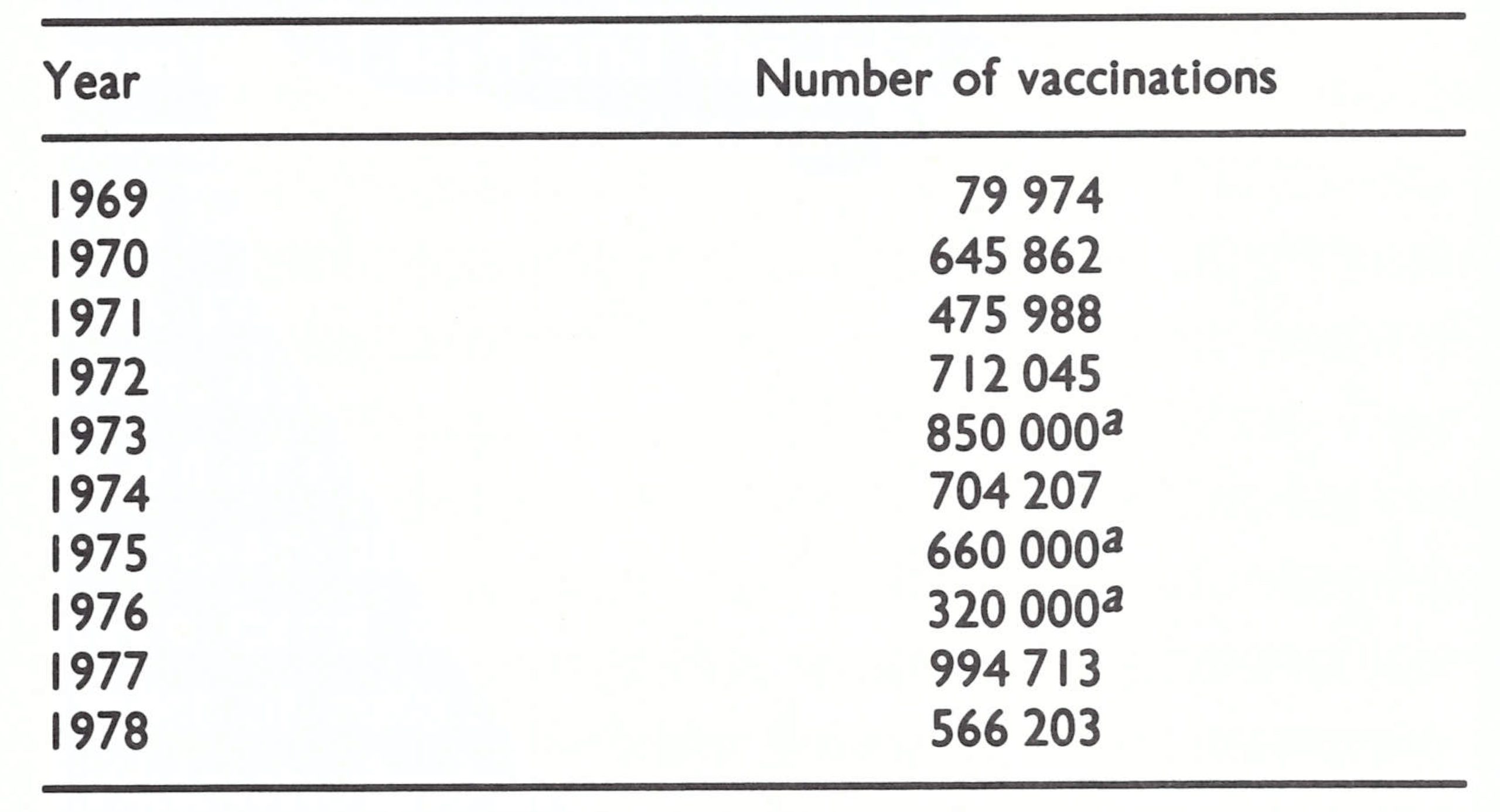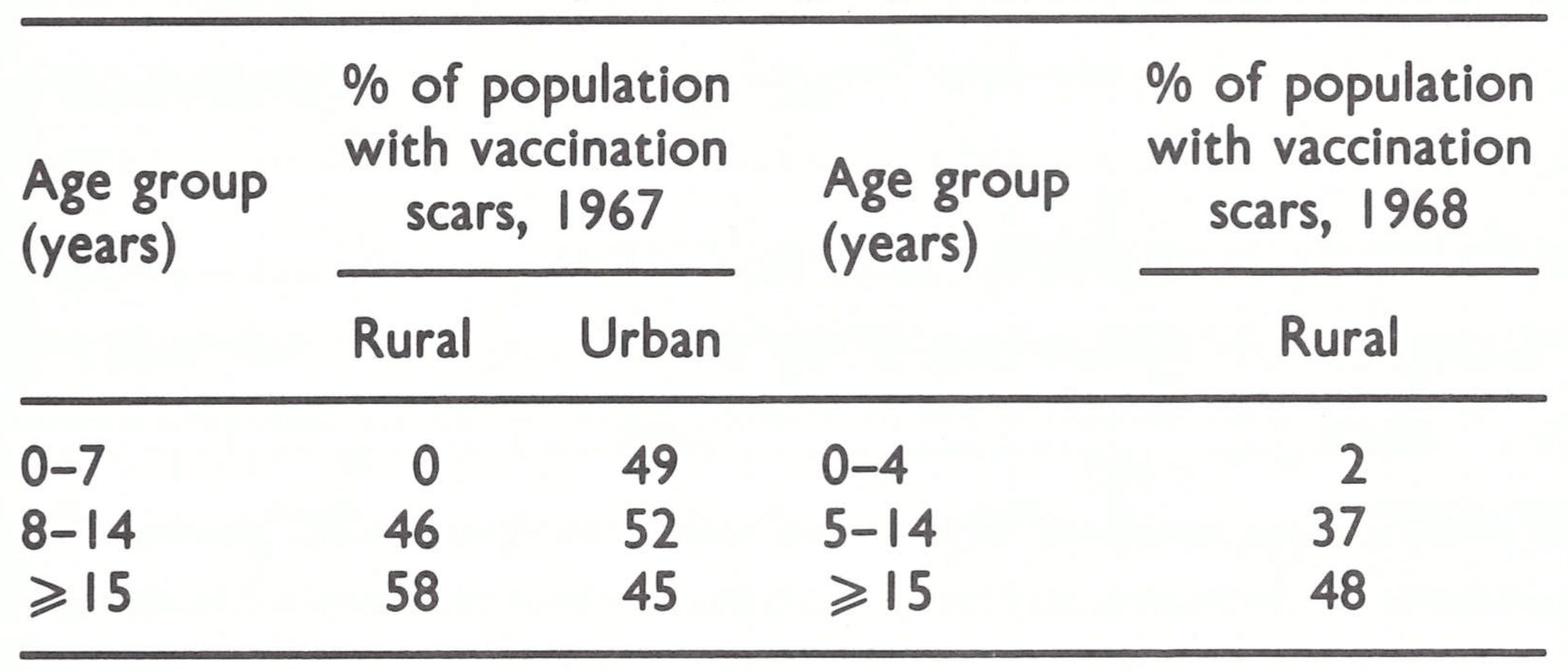 The infrequent occurrence of smallpox in the French Territory of the Afars and the Issas and the cessation of transmission in Somalia in 1962 could not be attributed to national vaccination campaigns. Both countries offered vaccination for those travelling abroad and conducted localized vaccination campaigns when outbreaks occurred. The French Territory of the Afats and the Issas carried out its first country-wide campaign in 1966, during which 115 000 people were vaccinated ; thereafter, campaigns using freeze-dried vaccine were conducted every 3 years, each resulting in the vaccination of 100 000-1 20 000 persons. Somalia, using a locally produced liquid vaccine until 1966, vaccinated only 20 000-50 000 persons a year, primarily the inhabitants of major towns who required vaccination certificates for travel. I n addition, because of outbreaks, special vaccination campaigns were conducted in 1962 near the Kenyan frontier and in 1966 near the border of the French Territory of the Afars and the Issas and in Mogadishu. During the latter campaign, 194 000 persons were vaccinated, but with vaccine of dubious quality ;a study carried out in 1967 revealed that only 14% of those given primary vaccination had had successful takes.
