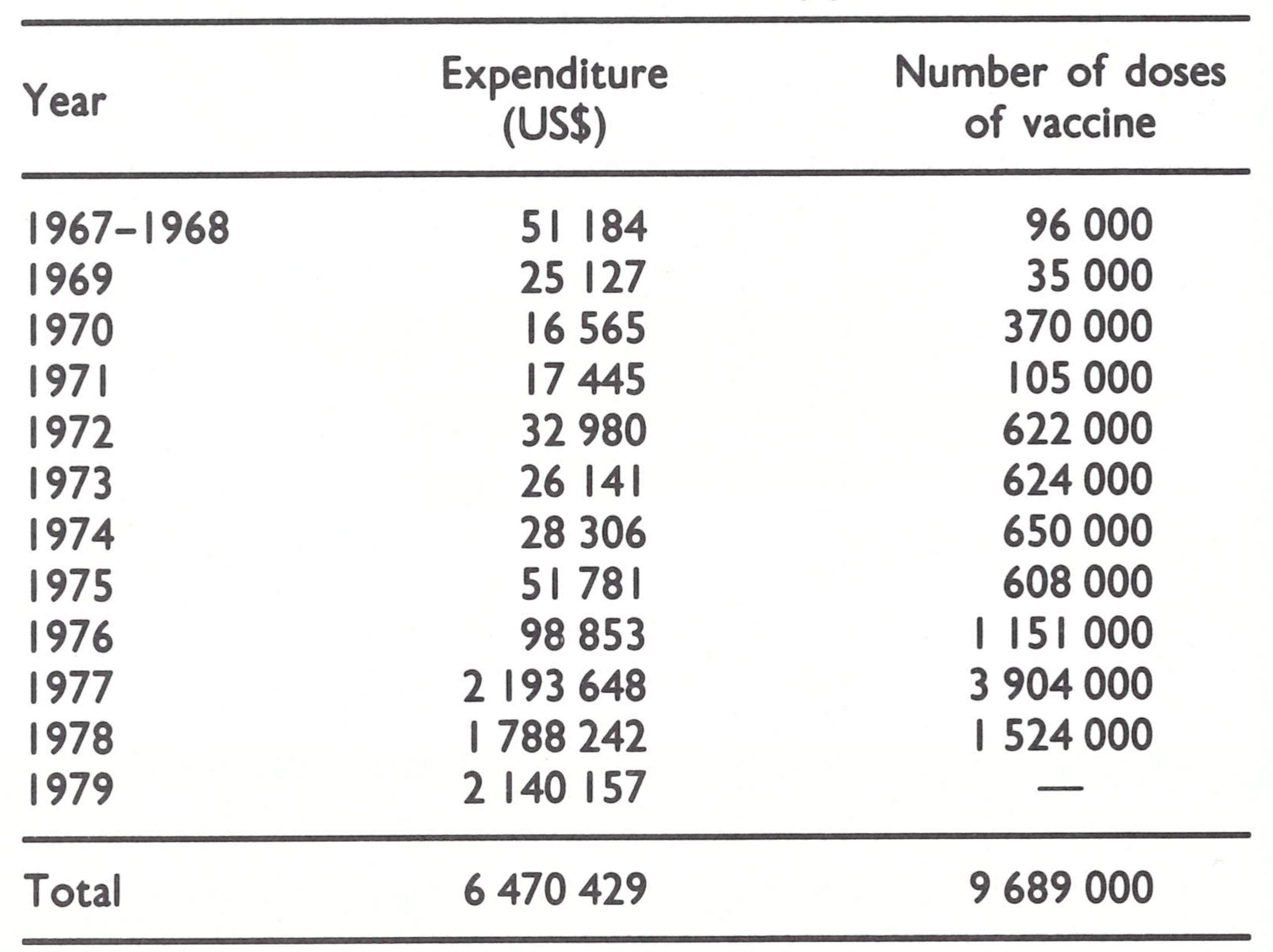 Table 22.3: Somalia: expenditure by WHO for smallpox eradication and number of doses of vaccine supplied, 1967-1979