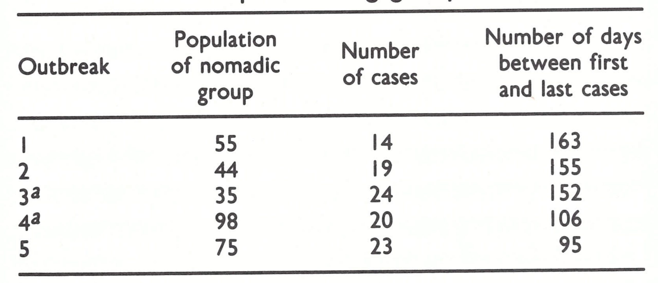 The number of new outbreaks occurring during April and May far exceeded the capacity of the few advisers and an as yet untrained staff to cope with them. With the declaration of the emergency in May and the influx of personnel and resources in June, the epidemic began to come rapidly under control. As political leaders and numerous volunteers actively participated, the interval between the onset of the first case and the detection of outbreaks decreased, as did the interval between the first and last cases in the outbreaks (Table 22.8). The outbreaks were more effectively contained, and, in consequence, became smaller (Table 22.9) and soon disappeared from the larger towns and villages (Table 22.10). In April 50% of the outbreaks occurred among nomads, a proportion which rose to 75% in June and to more than 90% in July. In all, 570 out of 843 outbreaks for which data are available were among nomads.