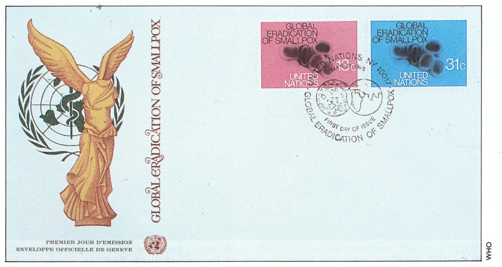 Plate 31.2. First-day cover issued by the United Nations, commemorates the global eradication of smallpox. Variola virus virions as they appear under the electron microscope are shown on the stamps. A replica of the Winged Victory of Samothrace (on the left of the envelope) was presented to WHO when it received the Albert J. Lasker Special Award for Public Service from the Albert and Mary Lasker Foundation in recognition of the role the Organization played in eradicating smallpox.