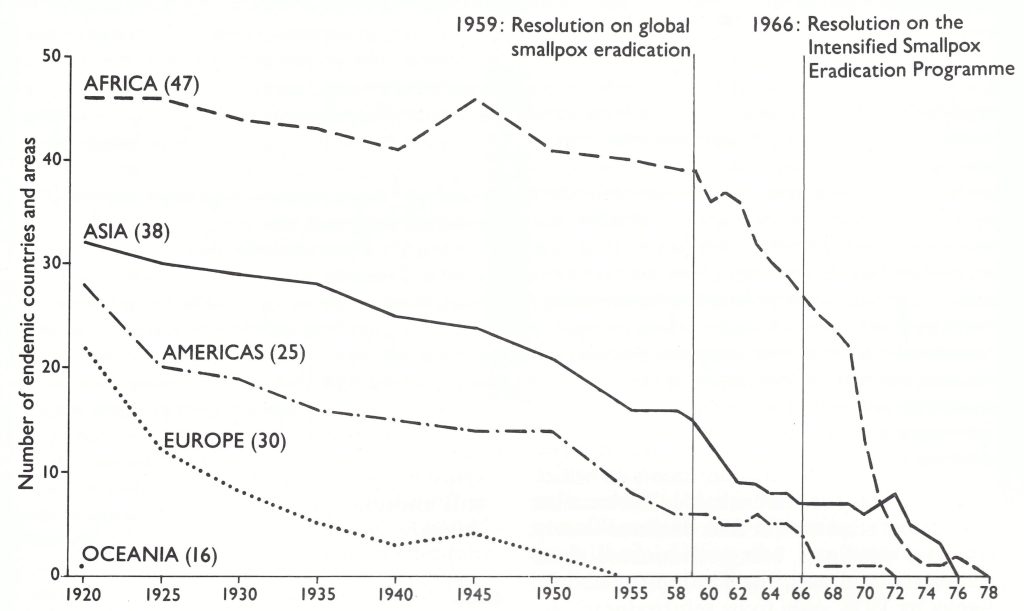Fig. 4.1.  Numbers of countries and territories in which smallpox was endemic between 1920 and 1978, arranged by continent. The figures in brackets indicate the numbers of countries and territories involved. Their names (as of 1986) are listed below.