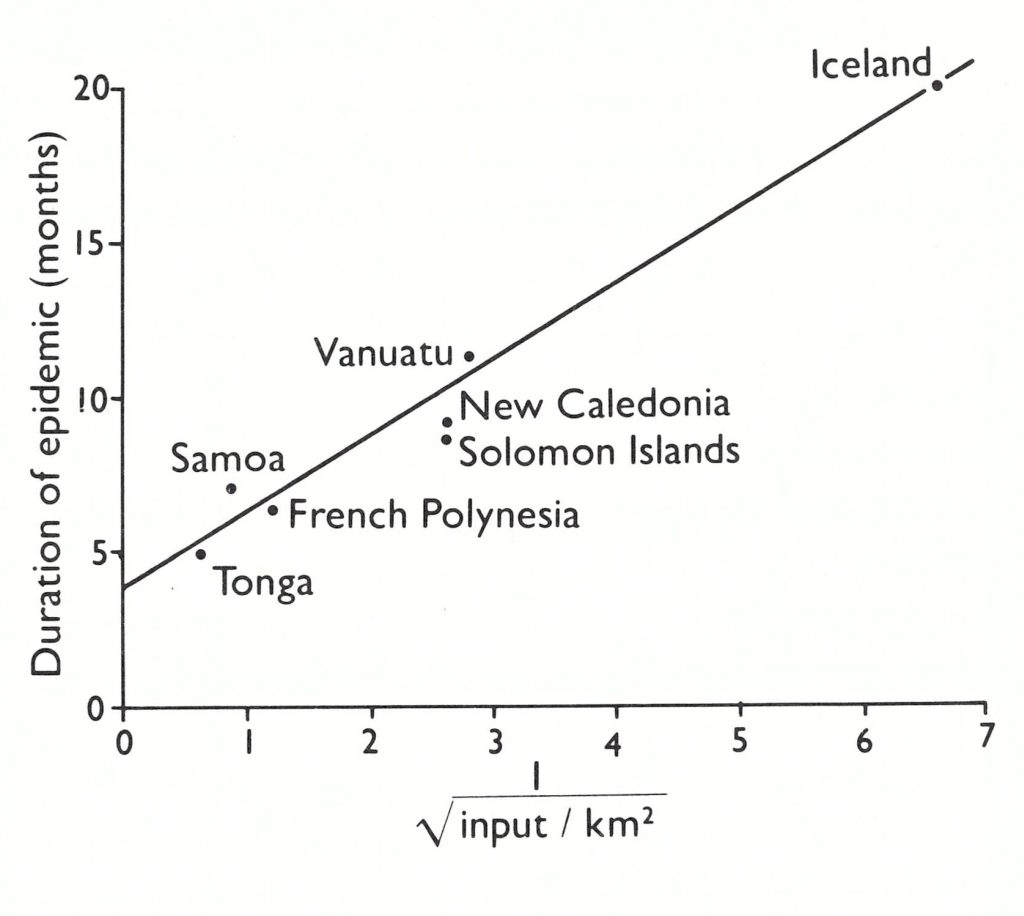Fig 4.10. Relationship between population density and the duration of epidemics of measles. The average distance, in kilometres, between newborn infants added to the respective populations each year is given in terms of the inverse square root of the number of new susceptible individuals added to the population per square kilometre. In island populations of roughly comparable size, the duration of epidemics was inversely proportional to the density of the population. (From Black, 1966 .)