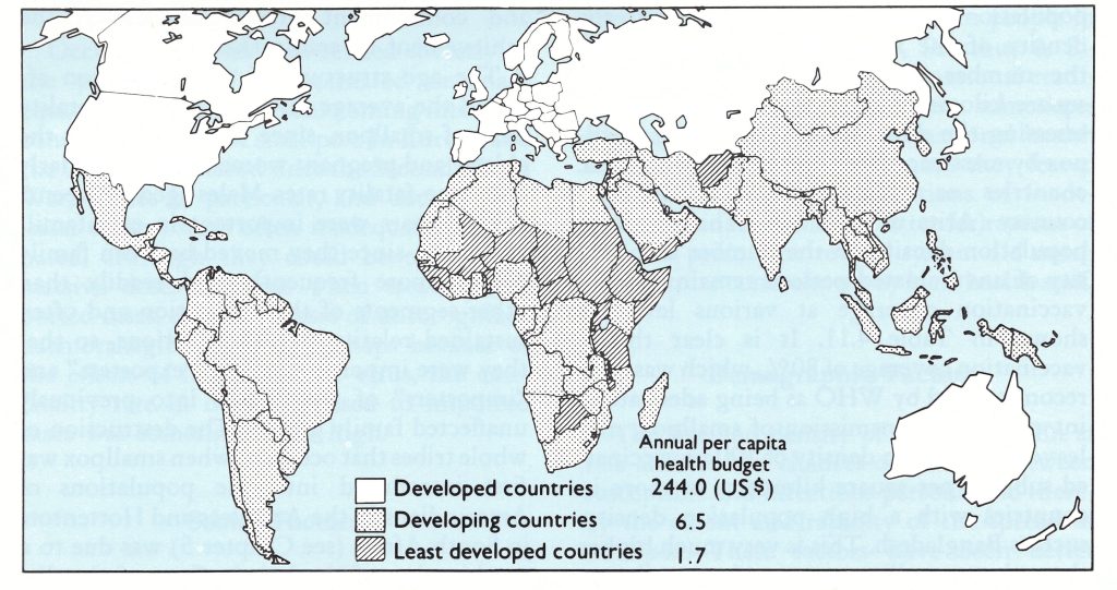 Fig 4.11. National levels of economic development, as determined by the United Nations on the basis of average per capita income for the year 1982. Average per capita expenditures on health in US$ are also shown.