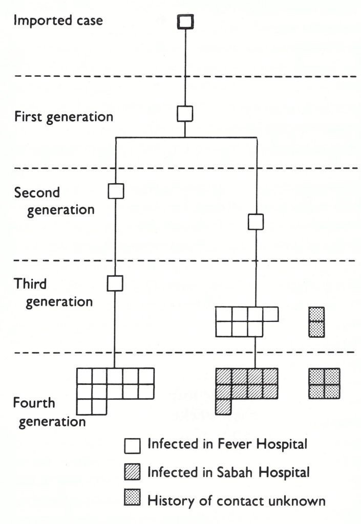 Kuwait is a small country which in 1967 had been free of endemic smallpox for the previous 10 years, but which was constantly exposed to the risk of importations from nearby endemic countries. Smallpox misdiagnosed as chickenpox spread in the Fever Hospital over a period of 2 months before a second generation fatal case was correctly diagnosed, after it had caused 9 third generation cases. One of these, unrecognized, was transferred to another hospital (Sabah), where it produced several more cases (Fig. 4.12). Twenty-one of the 39 cases were in children under 4 years of age; only 8 patients, 6 of them aged 15 years or more, had ever been vaccinated. In contrast to the usual situation in Europe, all cases, except one vaccine-modified attack, occurred among patients rather than nurses or other hospital personnel, whose immune status had been maintained by regular revaccination (Arita et al.,1970).