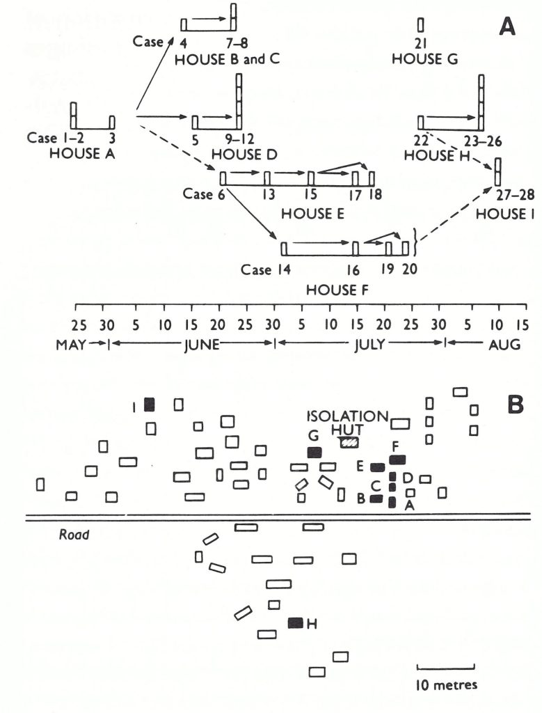 Fig 4.13. The spread of smallpox in a village in Benin of 300 inhabitants, living in 59 houses, extending from May to the end of August 1967. A: Chronology and spread. Solid lines = routes of transmission; broken lines = probable routes of transmission. B: Location of households. (Based on Henderson & Yekpe, 1969.)