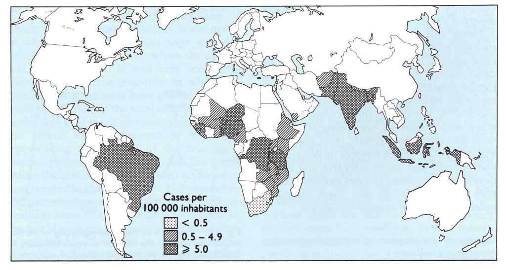 In 1959 the Twelfth World Health Assembly adopted a resolution introduced by the USSR calling for the worldwide eradication of smallpox (see Chapter 9), confident in the knowledge that eradication had by then been achieved in Europe and in North and Central America. The situation in South America appeared to be manageable, and indeed the number of endemic countries decreased until, by 1967, smallpox remained endemic only in Brazil. The real problem was posed by the developing countries of Africa and Asia. During the few years between 1959 and 1966, there were substantial gains in Asia, the most important of which was the elimination of endemic smallpox from China. This was achieved by 1961 and was due entirely to a national initiative. Smallpox, however, remained rampant in the Indian subcontinent. Some progress was made in western and southern Africa, but in 1966 the disease was still endemic in 27 of the 47 countries of Africa.